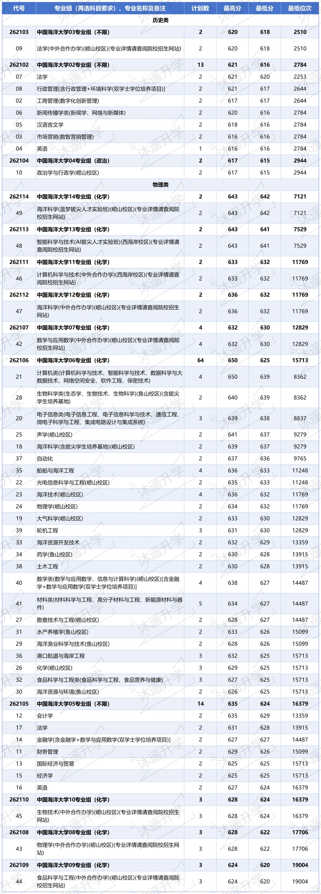 ,海洋科学(拔尖人才实验班,最低分642,位次7121)与智能科学与技术(中外合作,最低分641,位次7529)分数领跑,体现了传统优势与前沿交叉学科的双重吸引力。