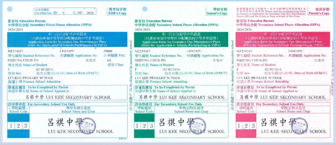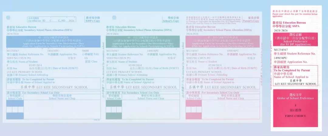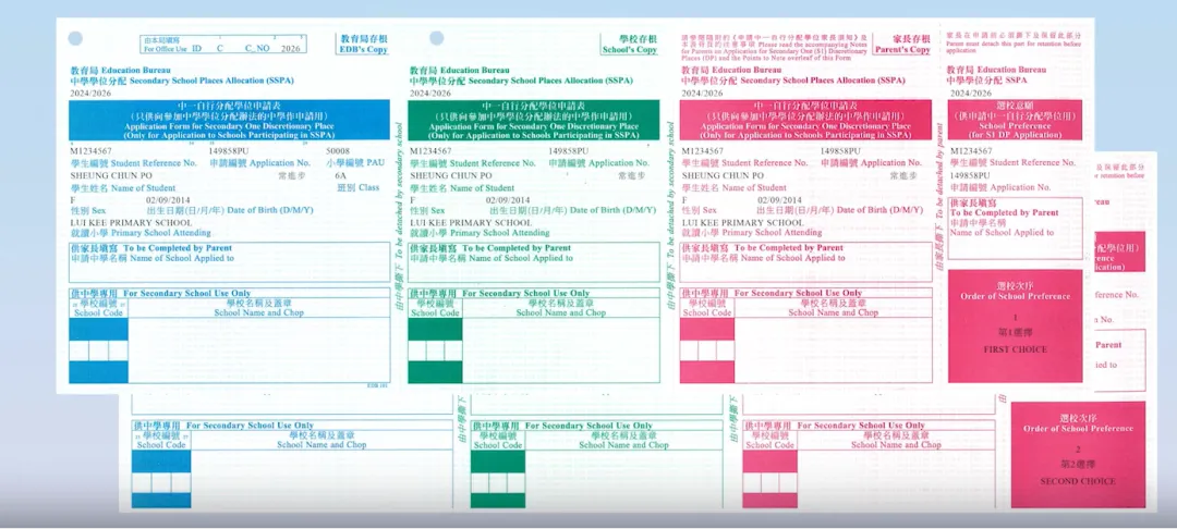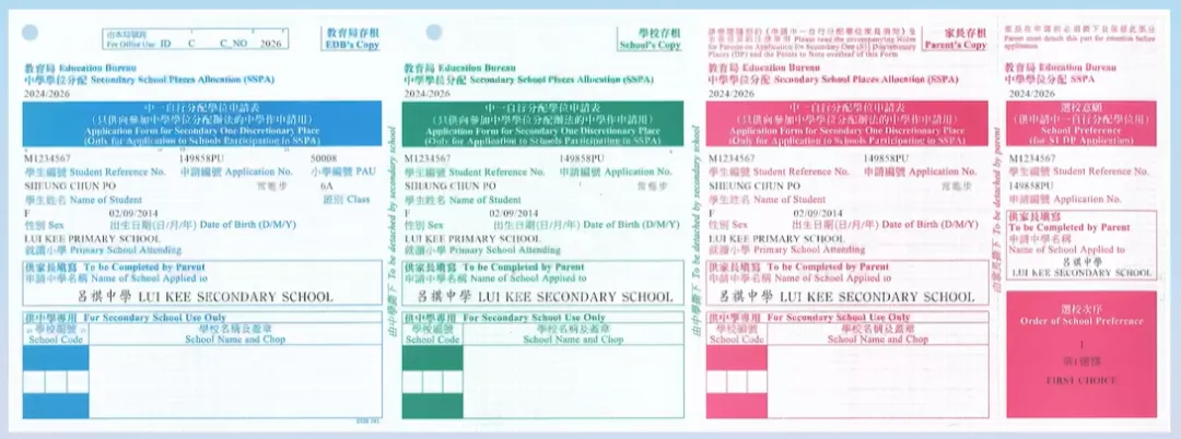 每份申请表共有四联,分别是「教育局存根」(蓝色)、「学校存根」(绿色)、「家长存根」(红色)及「选校次序」(「选校次序 1」代表首选的学校,「选校次序 2」代表次选的学校)(红色),并且已经预印学生的个人资料。