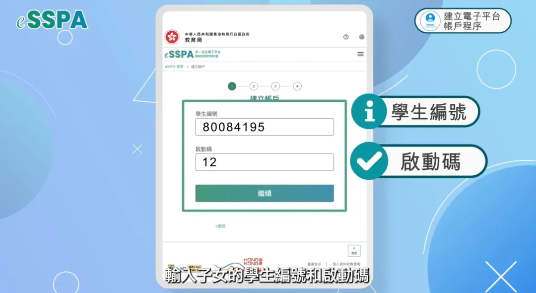 使用小学分发的「启动码」及子女的学生编号建立账户。