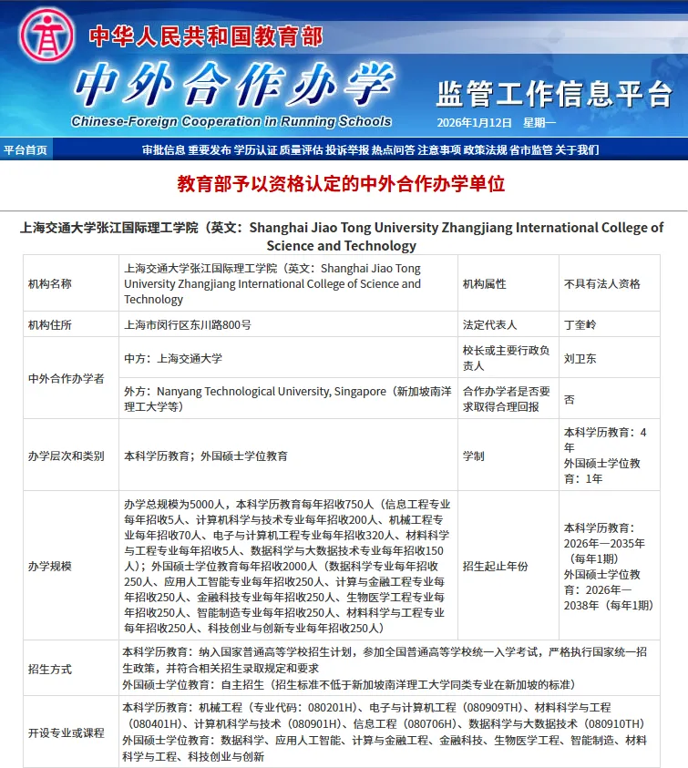 教育部重磅官宣批复!上海交通大学与新加坡南洋理工大学强强联手,共同创办上海交通大学张江国际理工学院,为2026年升学季献上一枚 “王炸级” 彩蛋!