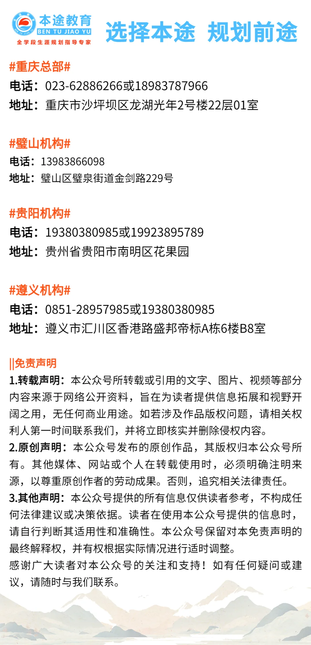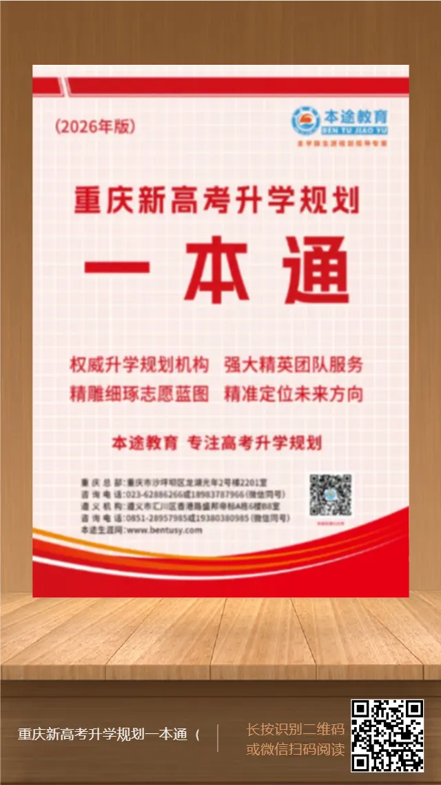 时光匆匆,2026年高考的脚步日益临近。家有高三学子的您,是否正真切感受到时间飞逝,转瞬即逝?仅剩四个多月,孩子便要踏上高考这没有硝烟却激烈异常的战场,这是一场关乎孩子未来走向、容不得丝毫差错的关键战役!作为家长,此刻您内心想必五味杂陈,既满怀对孩子金榜题名的热切期待,又因不知能否给予最有力支持而心怀忐忑。在这场决定孩子人生走向的重要战斗中,升学规划无疑是最为关键的“战略部署”。它就像精准的导航,关乎孩子能否在茫茫院校与专业海洋中精准定位,能否科学合理地填报志愿,最终顺利踏入理想大学的校门。高考,对孩子而言是一场硬仗,对家长来说更是一场智慧与远见的严峻考验。在这场没有硝烟的激烈角逐中,分数固然是重要的基石,但科学的升学规划才是孩子通往理想大学的那把至关重要的金钥匙!或许此刻您正满心迷茫:升学规划究竟该从何处着手?是不是要等到分数揭晓的那一刻才匆忙行动?不!时间从不等人,规划必须趁早!分数揭晓后,若不提前规划,很多合适的机会可能就错过了。只有提前规划,才能让孩子在这场激烈的竞争中抢占先机,让每一分都能发挥出最大的价值,为孩子的未来铺就一条光明坦途。那么,现在究竟该做什么呢?立即领取《重庆新高考升学规划一本通(2026年版)》和升学志愿卡!这两份珍贵的资料,将为孩子的升学之路增添一份坚实的保障,让遗憾远离,让梦想照进现实,助力孩子离理想大学更近一步!这本由本途教育资深升学规划专家团队倾力打造的手册,堪称重庆家长的“升学宝典”。它汇聚了专家们多年的心血与智慧,每一页都蕴含着帮助孩子“分数最大化利用”的黄金法则:升学路径全解析:从高考统招到强基计划、专项计划,再到公费师范生、定向培养军士、港澳院校招生……每条路径的报名时间、报考条件、录取规则,都讲解得细致入微,助力孩子找到“低分高录”的捷径。新高考政策深度剖析:录取批次、志愿设置、投档规则……这些曾经让您头疼不已的专业术语,现在一目了然,让您对孩子的定位心中有数,不再迷茫。志愿填报避坑秘籍:拆解志愿填报逻辑,明确7大必看信息、7大考量因素,助您避开“网红思维”“一键生成”等误区,确保投档后不被退档,让孩子稳操胜券。体检+专业+城市全攻略:845个本科专业深度解析,军校/公安院校等对身高视力的硬性要求,不同城市的院校资源分布……提前规避“隐形门槛”,让孩子少走弯路。为何选择这本手册?这本手册由深耕重庆新高考多年的专家团队编写,查阅海量资料核实信息,内容全面且精准,让您放心依赖。同时,把复杂的政策、繁琐的流程简化成通俗语言,让您不用再熬夜查资料、到处问熟人,轻松搞定升学规划。领取《一本通》的同时,您还将免费获得价值298元的升学志愿卡。这一张升学志愿卡,依托强大的本途新高考生涯规划系统,收录了2977所院校、845个本科专业、744个专科专业以及281个高职本科专业的关键数据。从院校的学科建设实力,到专业的详细介绍,包括修业年限、授予学位、培养目标、培养要求、主要课程、知识能力、考研方向等,一应俱全,让您对院校和专业有全方位、深层次的了解。不仅如此,系统还囊括了全国除港澳台西藏外其余30个省份的院校录取分数线、专业录取分数线、招生计划、投档线、批次线、一分一段表、同分考生去向等核心数据。这些数据犹如升学路上的明灯,为您清晰呈现历年录取趋势,让您精准把握孩子的成绩定位,为志愿填报提供坚实的数据依据。本途新高考生涯规划系统拥有生涯规划、智能选科、多元测评、智能填报四大强大功能,为孩子的升学之路提供一站式解决方案。生涯规划:帮助孩子明确未来的职业方向和发展路径,结合孩子的兴趣、特长和职业倾向,制定个性化的生涯规划方案,让升学选择与未来职业发展紧密相连。智能选科:根据新高考政策要求,结合孩子的学科优势和目标院校专业选科要求,智能推荐最适合的选科组合,为孩子的高考成功奠定基础。多元测评:通过科学专业的测评工具,全面了解孩子的性格、兴趣、能力等方面的特点,为志愿填报和生涯规划提供客观准确的参考依据。智能填报:输入孩子的成绩和相关信息,系统利用先进的算法和海量数据,智能生成“冲稳保垫”梯度志愿方案,大大提高志愿命中率,让孩子轻松考入理想大学。使用本途升学志愿卡非常便捷。您只需登录本途生涯(http://www.bentusy.com/)网址,在网页左上角点击“登录”,输入卡号和密码,进入系统后完善“个人信息”,即可开启这场全面而精准的升学规划之旅。无论您身处何地,只要有网络,就能随时随地为孩子的升学出谋划策。如此强大且实用的升学志愿卡,现在可免费领取!这不仅是节省了一笔开支,更是为孩子赢得了一次精准规划升学、迈向理想大学的机会。别再犹豫,立即领取升学志愿卡,让孩子在升学之路上少走弯路,轻松实现大学梦想!添加客服微信18983787966,回复“2026规划”,客服会及时回复您并指导领取流程,便捷高效。拨打咨询电话023-62886266或18983787966或19923895789,登记考生姓名+学校+联系方式,工作人员会在1个工作日内与您联系并安排资料寄送,省时省力。前往重庆市沙坪坝区龙湖光年2号楼2201室,现场领取还可与专家面对面咨询(地铁1号线、9号线、环线“沙坪坝站”8号出口直达),贴心服务。高考是