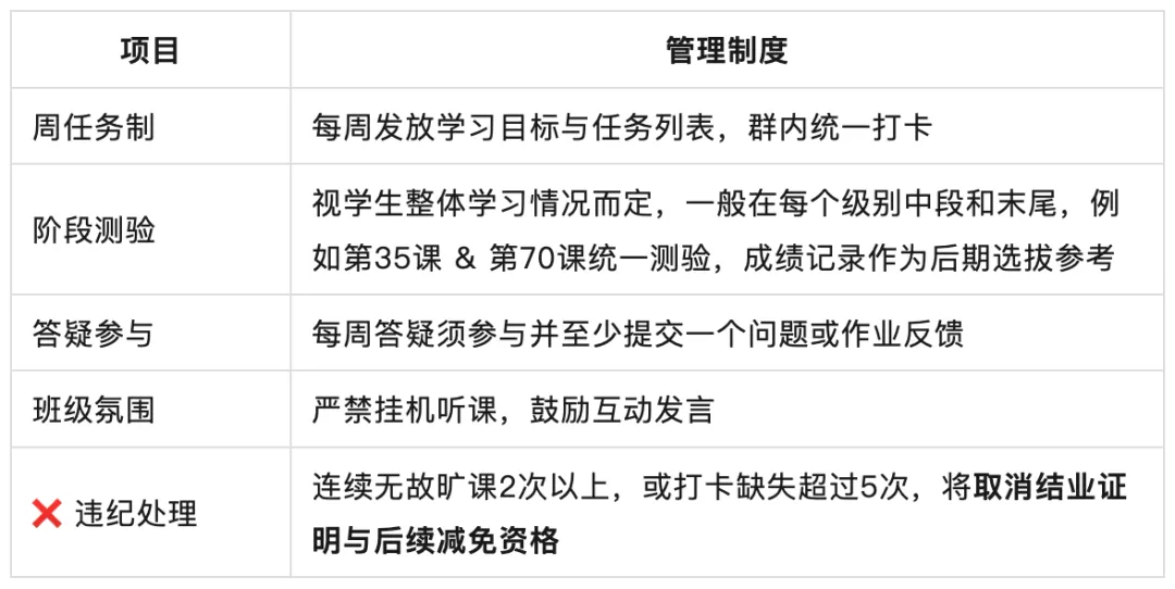 结业证书和奖励 | 满勤+考核达标者,颁发《优秀学员结业证书》和实物奖励 |