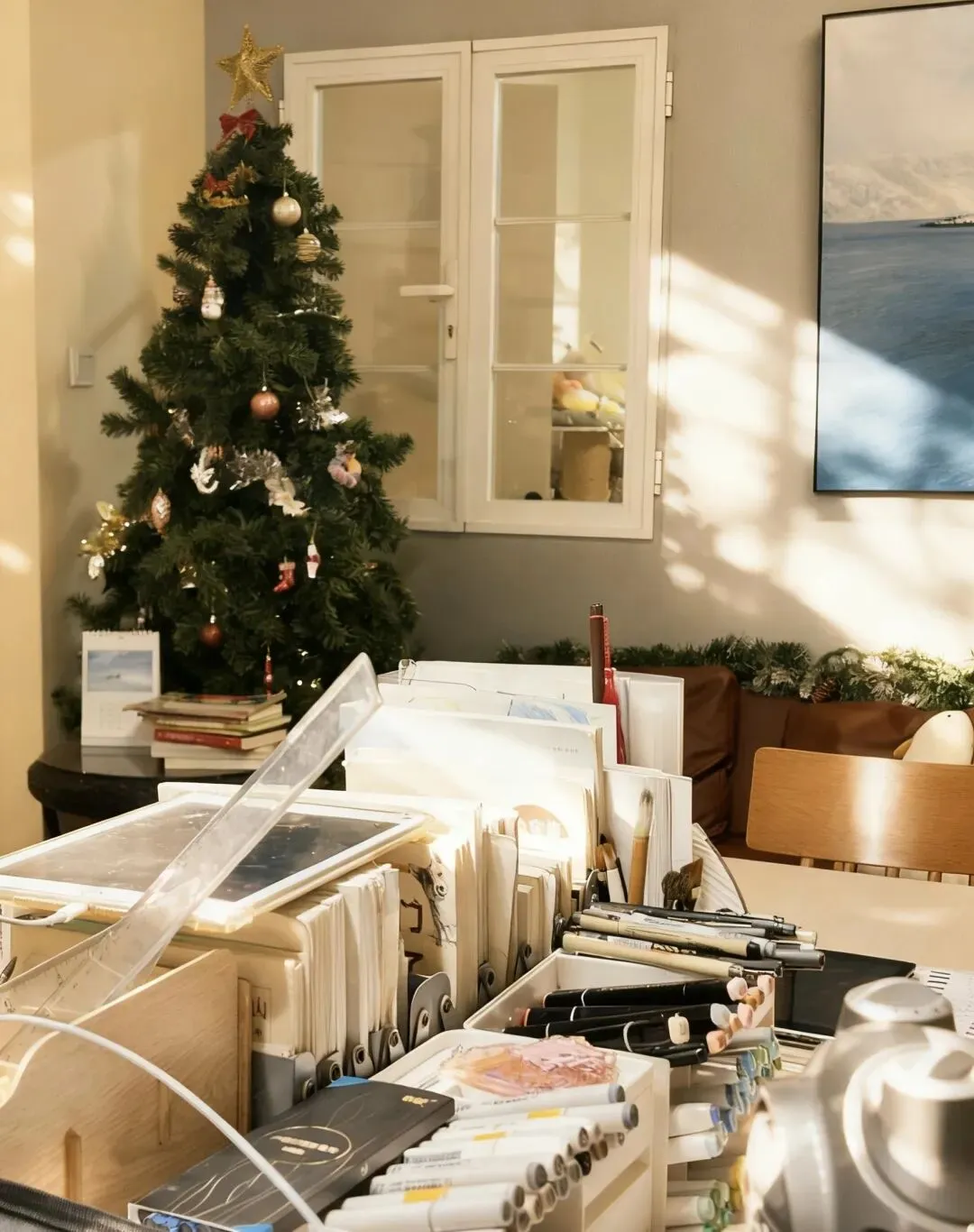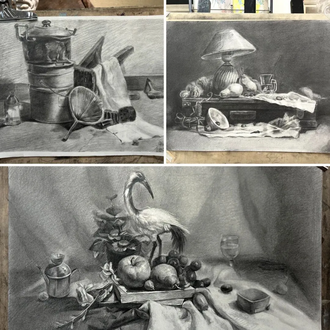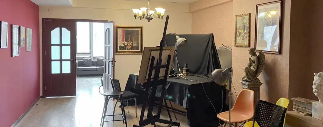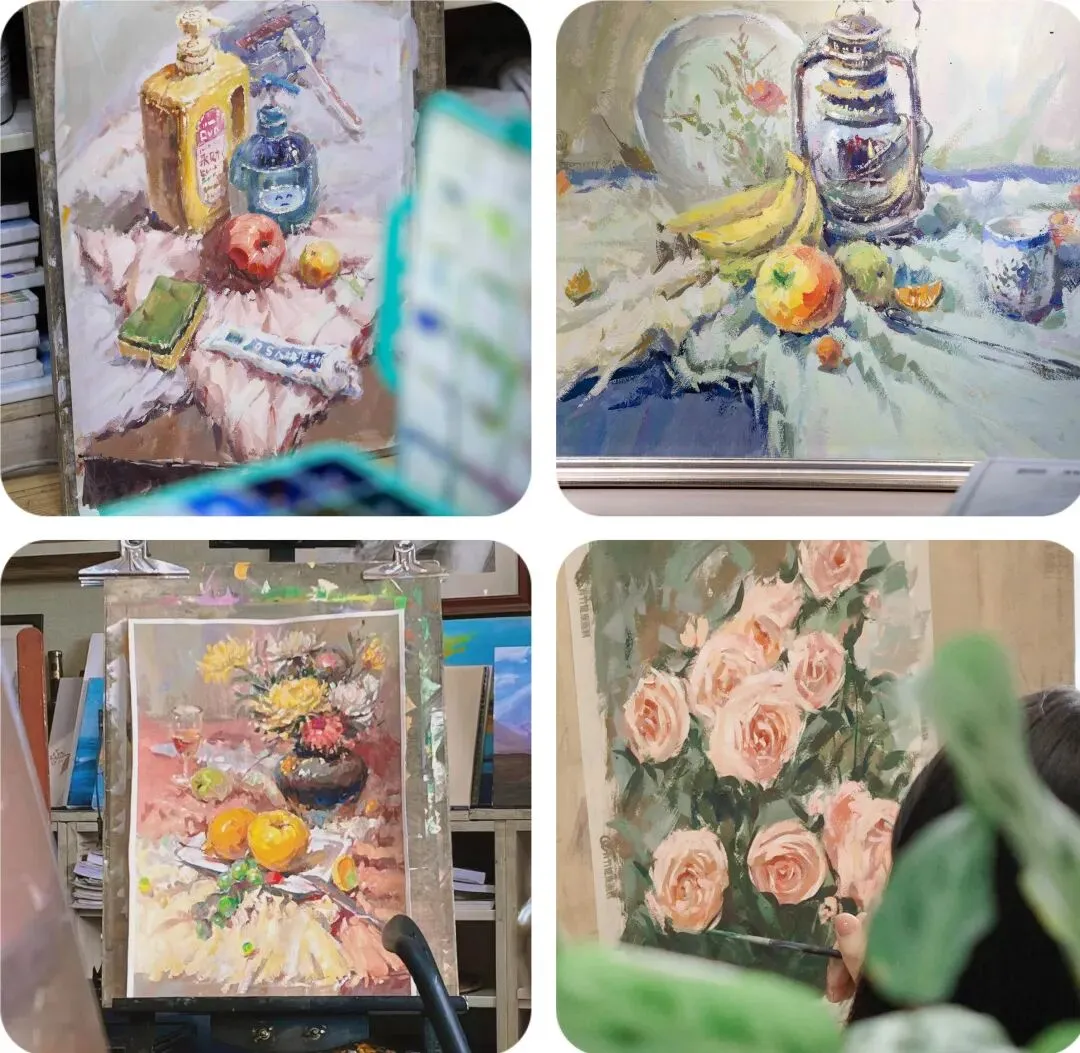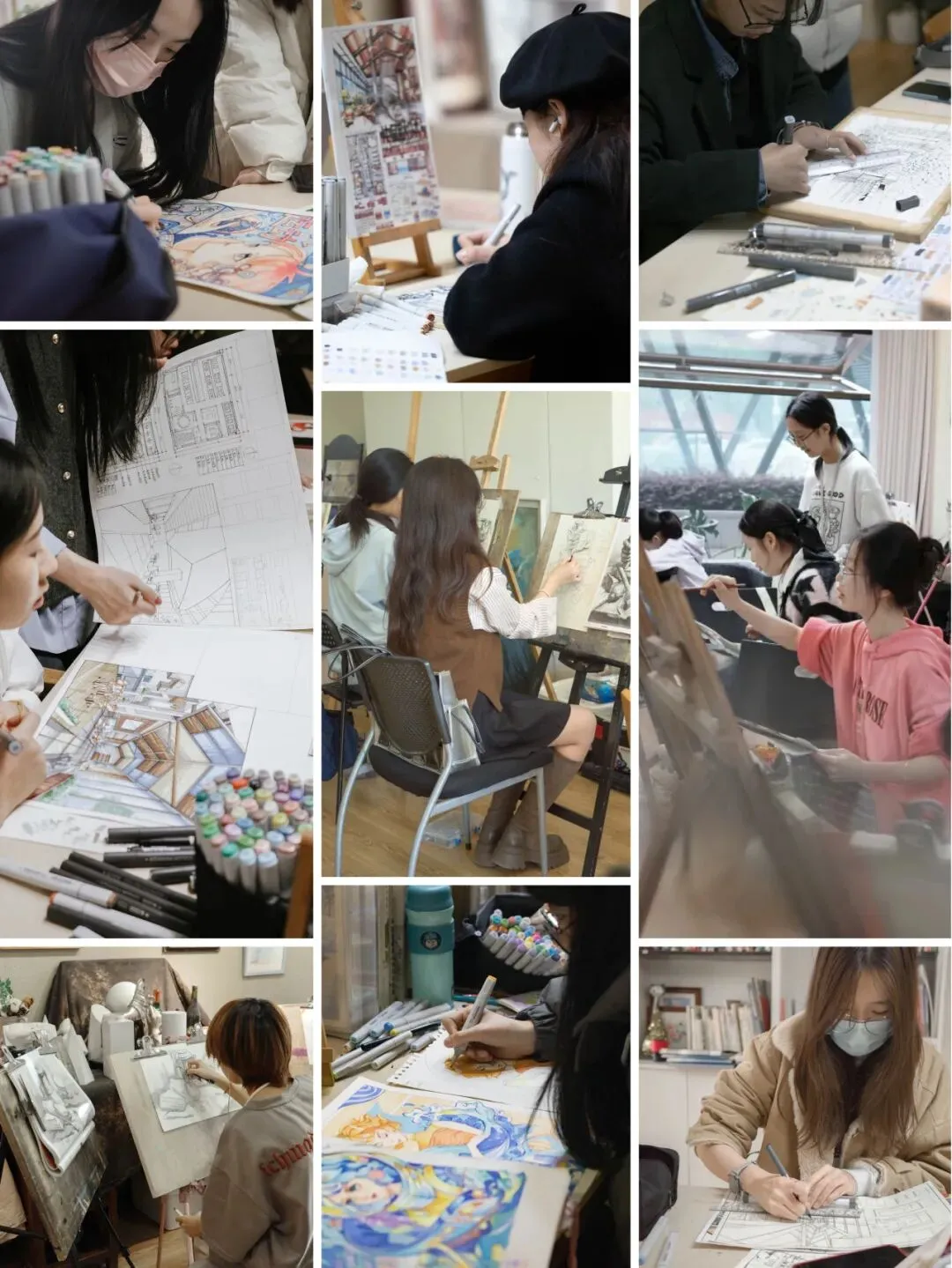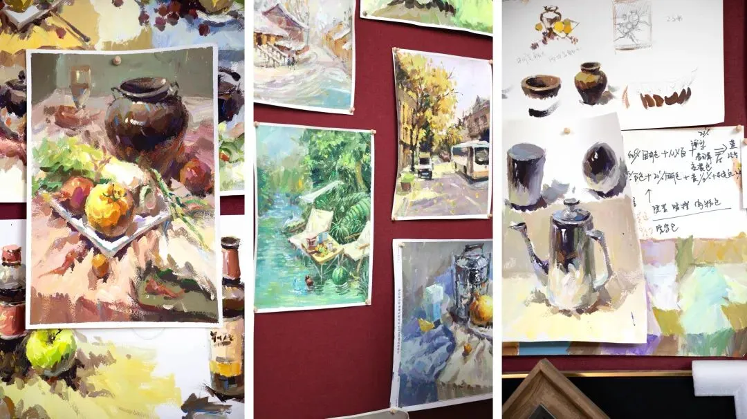京杭是我们精心呵护的艺术空间,每一处都烙着时光的印记。同学们的明信片、散落的画册、夕阳下的调色盘、师生不断更新的作品墙、画画时的同伴、创作中的老师,你不想在这样的画室里画画吗?