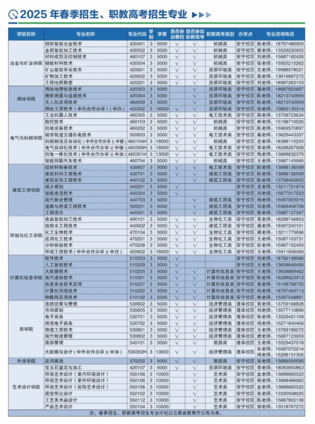 学校先后获得全国职业教育先进单位、全国首批高职高专人才培养工作水平评估优秀院校等,被誉为“冶金矿业高技能人才的摇篮”“云南高职教育排头兵”。在历年的全国高职院校综合排名、专业排名、办学满意度测评中,学校连续保持云南省高职院校第一名,跻身全国领先行列。昆学校以深厚的办学积淀、鲜明的办学特色,立足祖国西南边陲,服务国家和云南省发展战略。学校牵头成立了“西部边疆地区高职院校高质量发展联盟”,探索构建西部边疆地区高等职业教育发展新范式。学校国家“双高计划”建设以国评、省评“双优”收官,示范辐射作用发挥显著,面向澜湄区域和南亚东南亚输出中国职教品牌。招生咨询电话: 0871-66051572 0871-66051100 (7月14日-8月29日期间拨打)