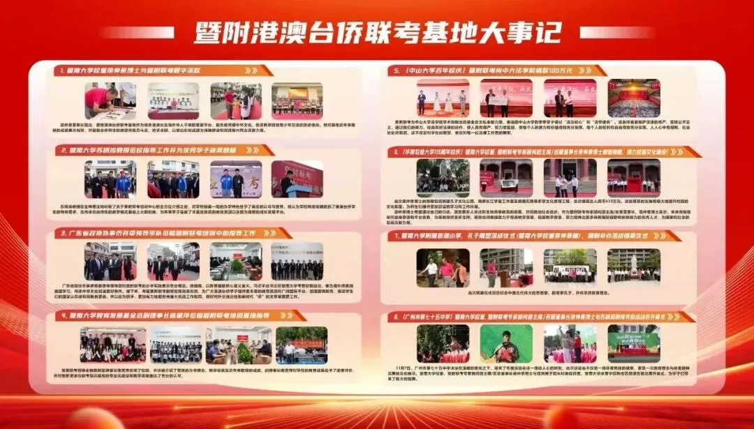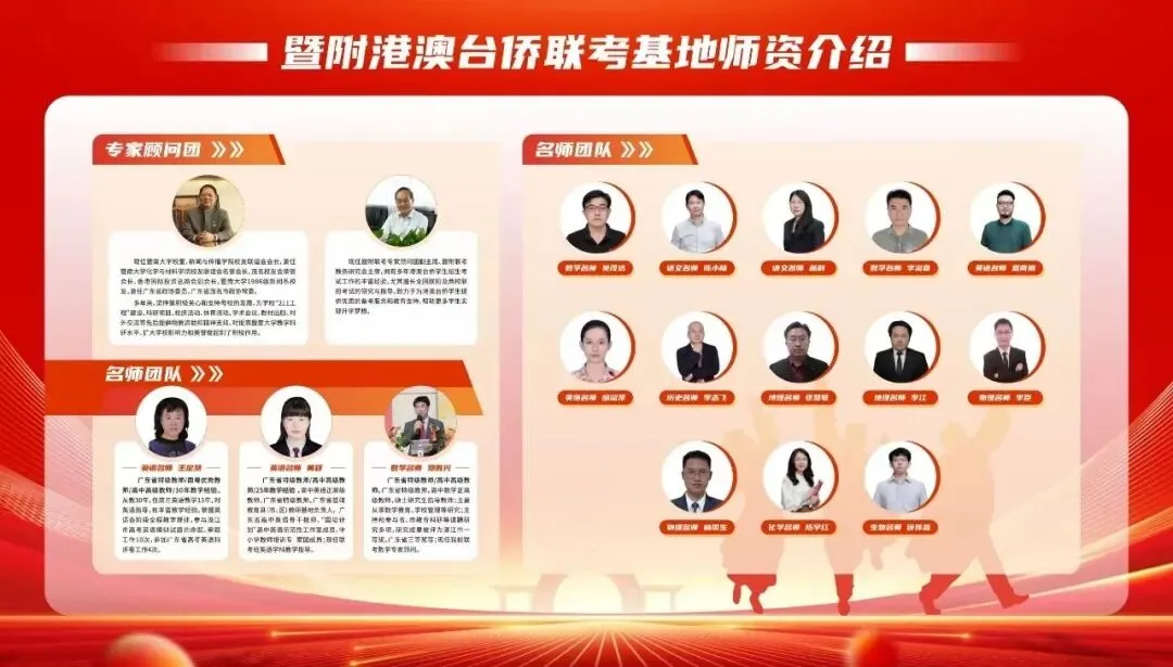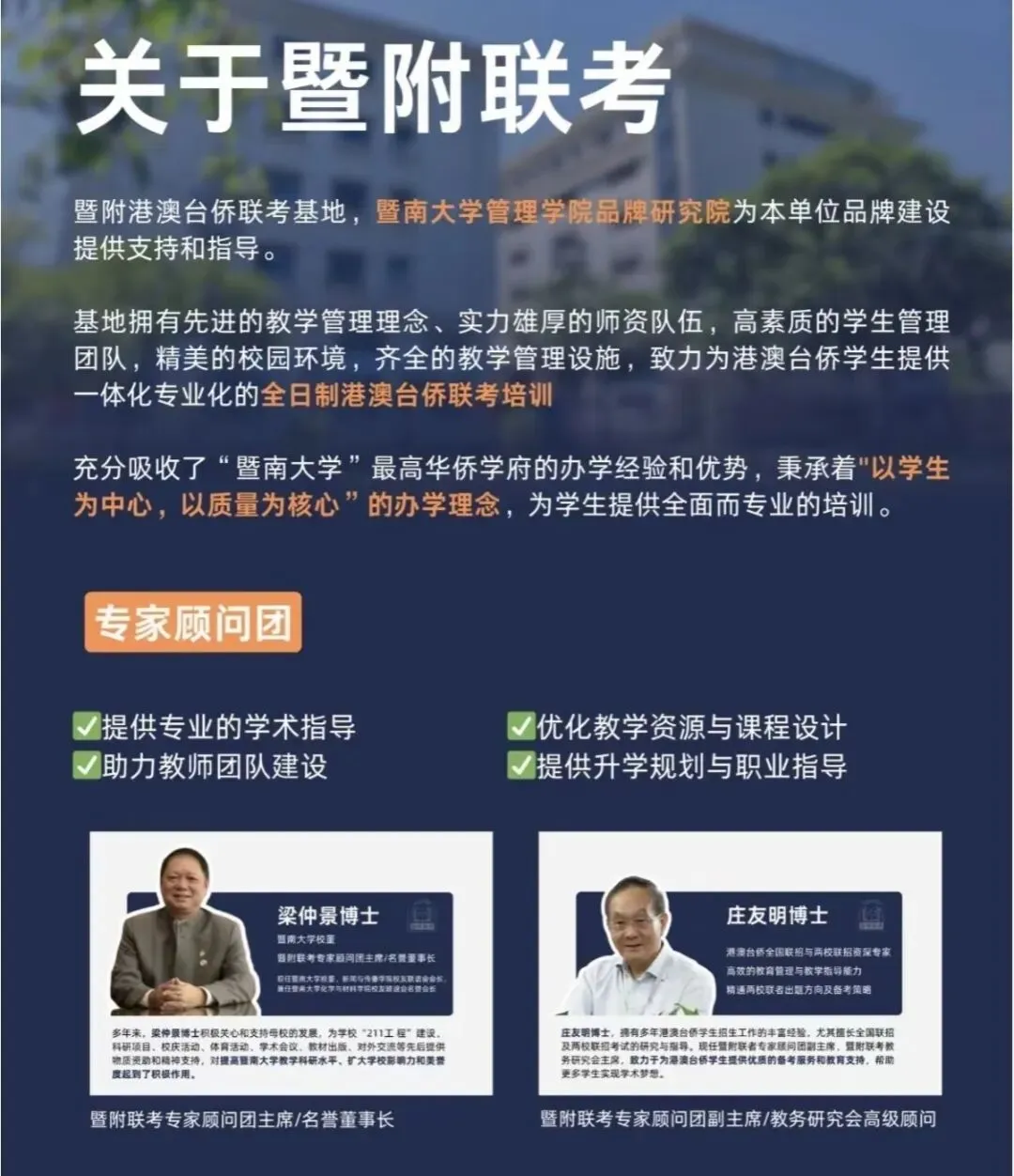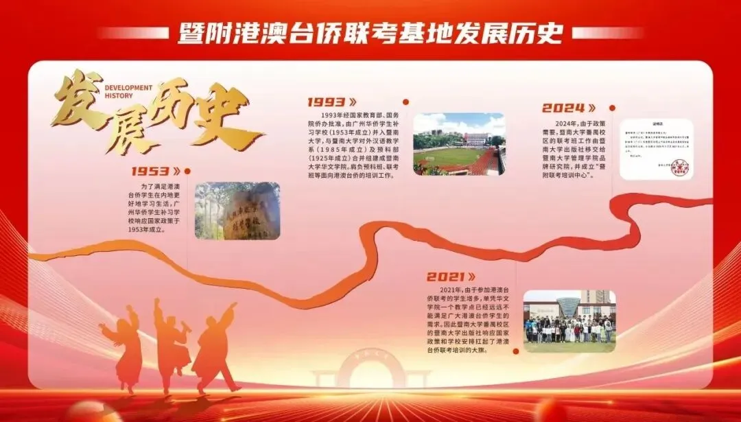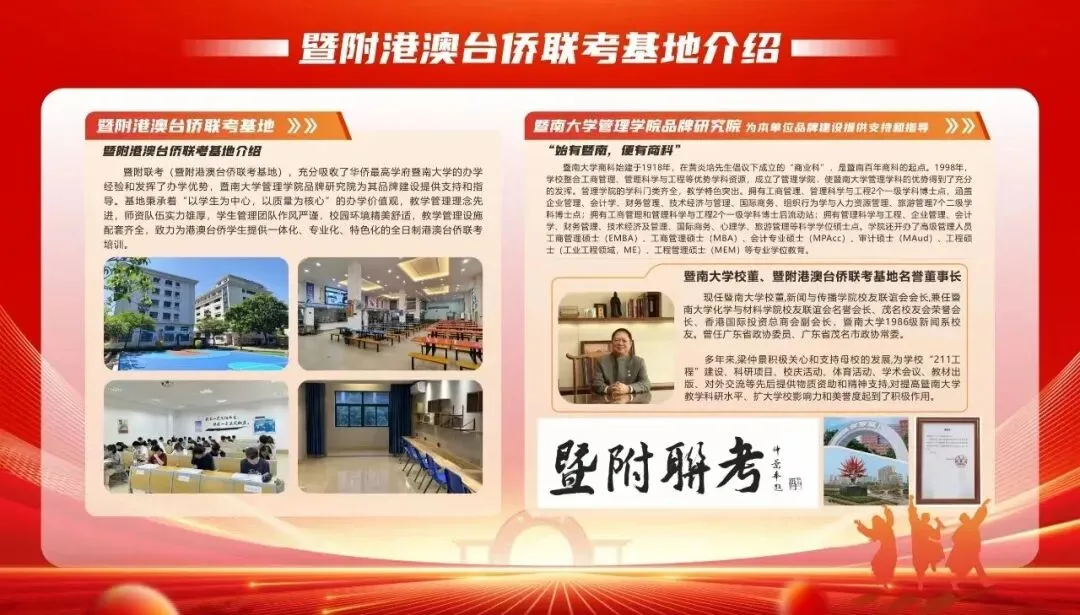 暨附联考(暨附港澳台侨联考基地),充分吸收了华侨最高学府暨南大学的办学经验,并发挥办学优势,暨南大学管理学院品牌研究院为其品牌建设提供支持和指导。基地秉承着“以学生为中心,以质量为核心”的办学价值观,教学管理理念先进,师资队伍实力雄厚,学生管理团队作风严谨,校园环境精美舒适,教学管理设施配套齐全,致力为港澳台侨学生提供一体化、专业化、特色化的全日制港澳台侨联考培训。