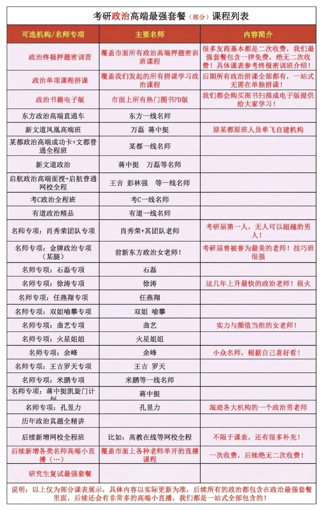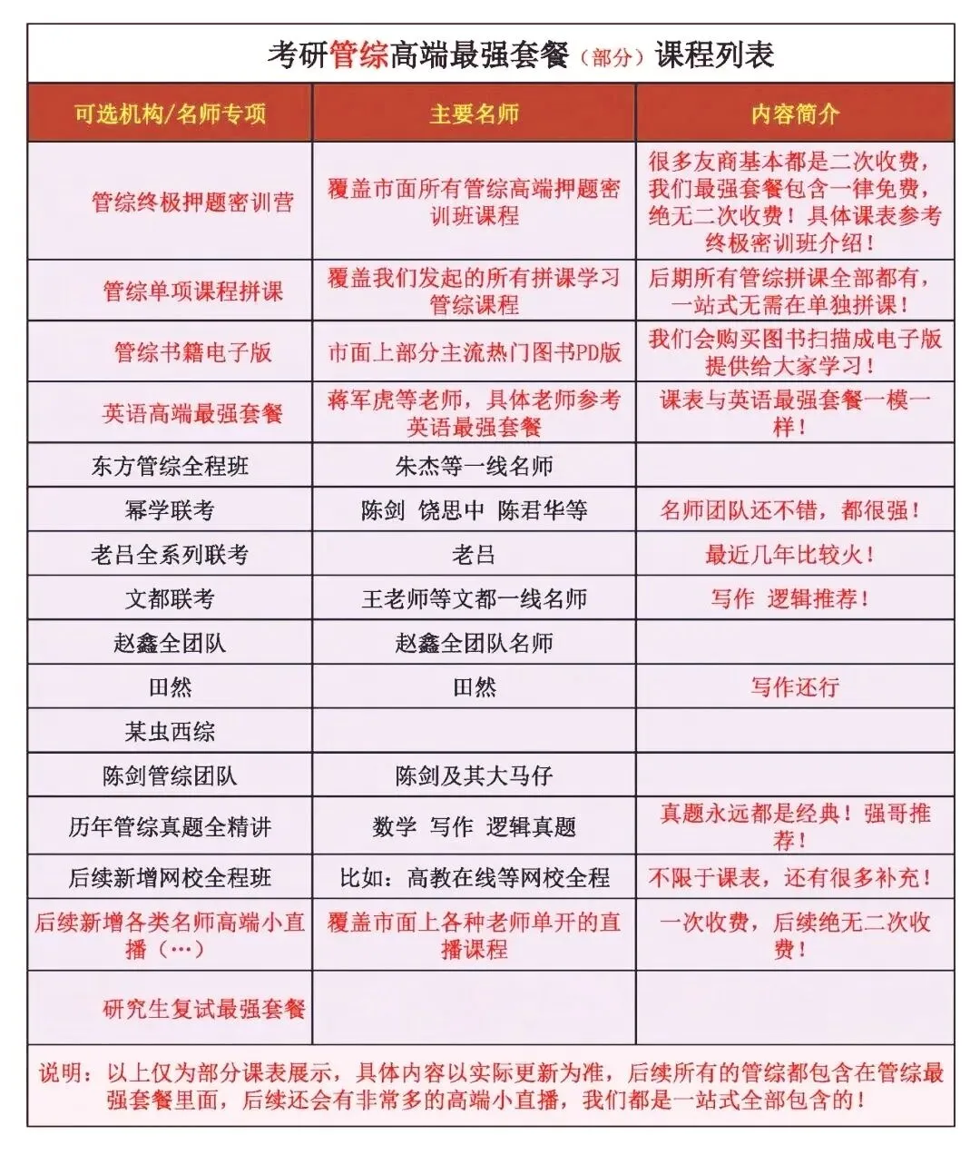 套餐完整包含:政治、英语、数学、管综、西综。这里展示的仅为冰山一角,我们致力于提供市面上你能找到的绝大部分优质课程内容。别人有的,我们都有;我们有的,让你一步到位。