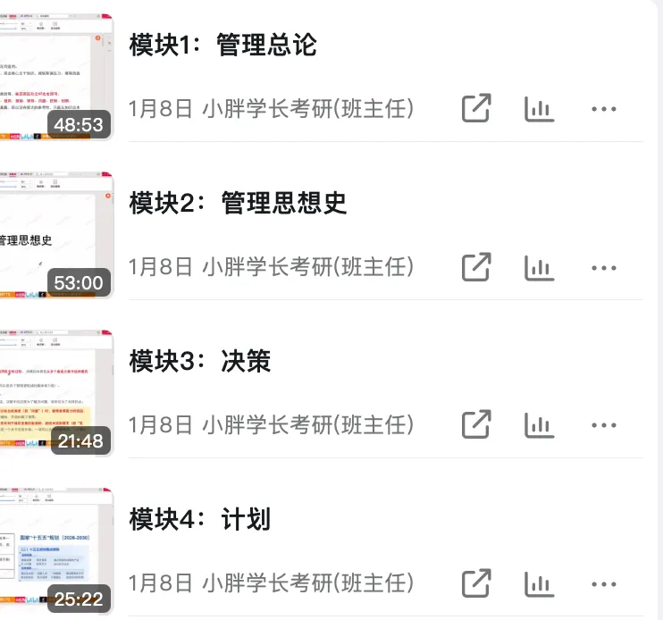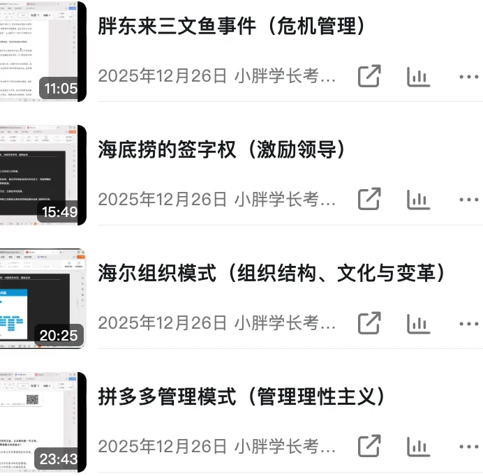 主讲老师:小胖学长,拥有9年考研初复试一线教学经验,善于从生活化的例子管理学知识。适用院校:26考研复试,MBA/MEM等专业,院校参考书为周三多版(第8版、7版、5版)或无指定参考书均可。课程理念:工作繁忙,时间有限,不知道如何系统准备?小胖学长管理学复试课程专为在职考生设计,从管理学专业知识、管理学案例分析框架、时事政治到面试实战,四大维度构建完整备考体系,让你复习有方向、答题有方法、面试有信心!课程总览:包括10课时左右的管理基础知识讲解,7个实用的管理案例分析。3课时综合面试指导课,2课时外语面试(英语语种)指导课,1-2课时政治(含时政)指导课。
