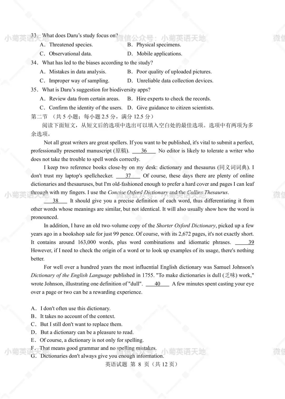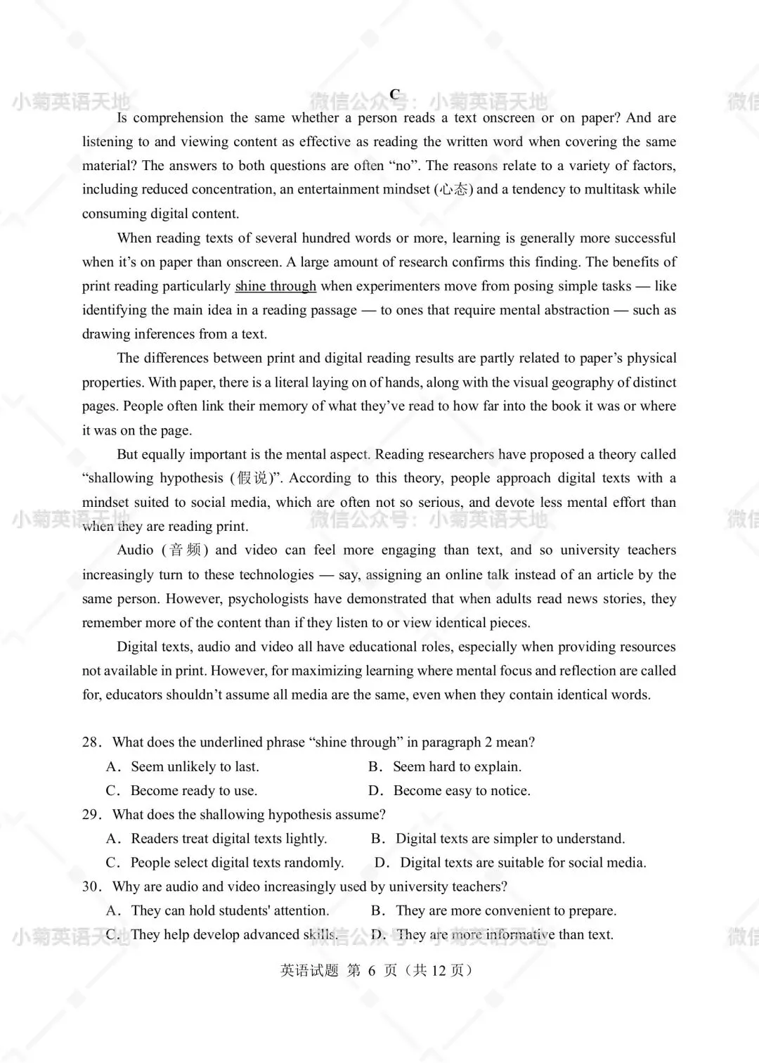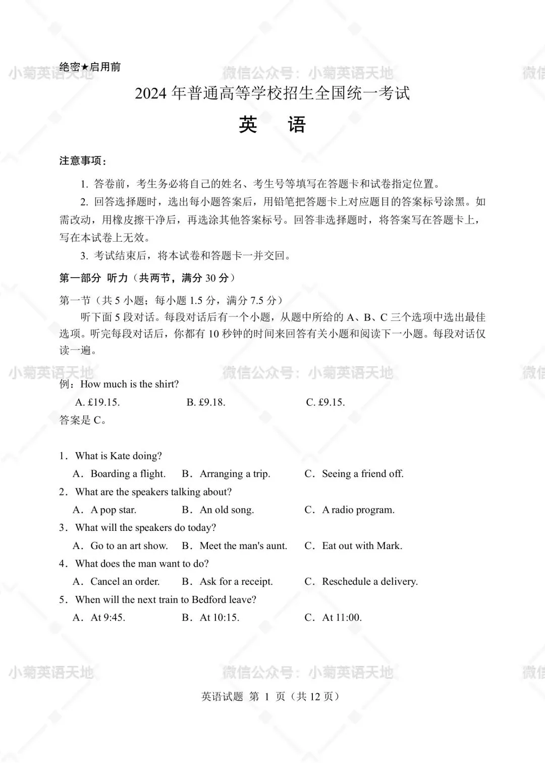 分享2024年普通高等学校招生全国统一考试英语试题(新课标一卷)(PDF版原卷)