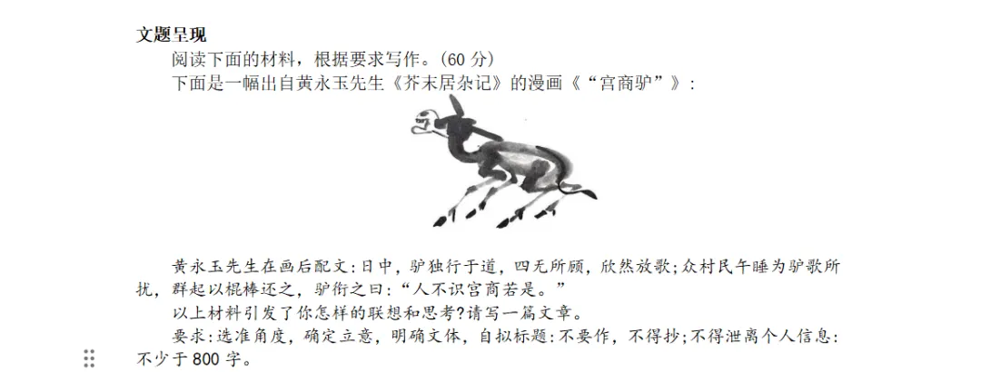 这是一道图文作文,文题中驴的漫画,形象逼真,放歌自得,给人予鲜明的印象。配文简明精当,驴陶醉于自我的“宫商”之中,村民却不堪其扰,直接以棍棒驱赶,呈现出驴与村民间激烈的对立冲突,最末一句,“人不识宫商若是”则揭示了主旨:人不解驴之“宫商”,而驴不懂村民之所需。据此,可以把握到命题人的用心在于从驴与村民间的矛盾,辩证地评析二者间不同的需求以及提出矛盾的解决方案,进而把握解决生活的冲突之道。