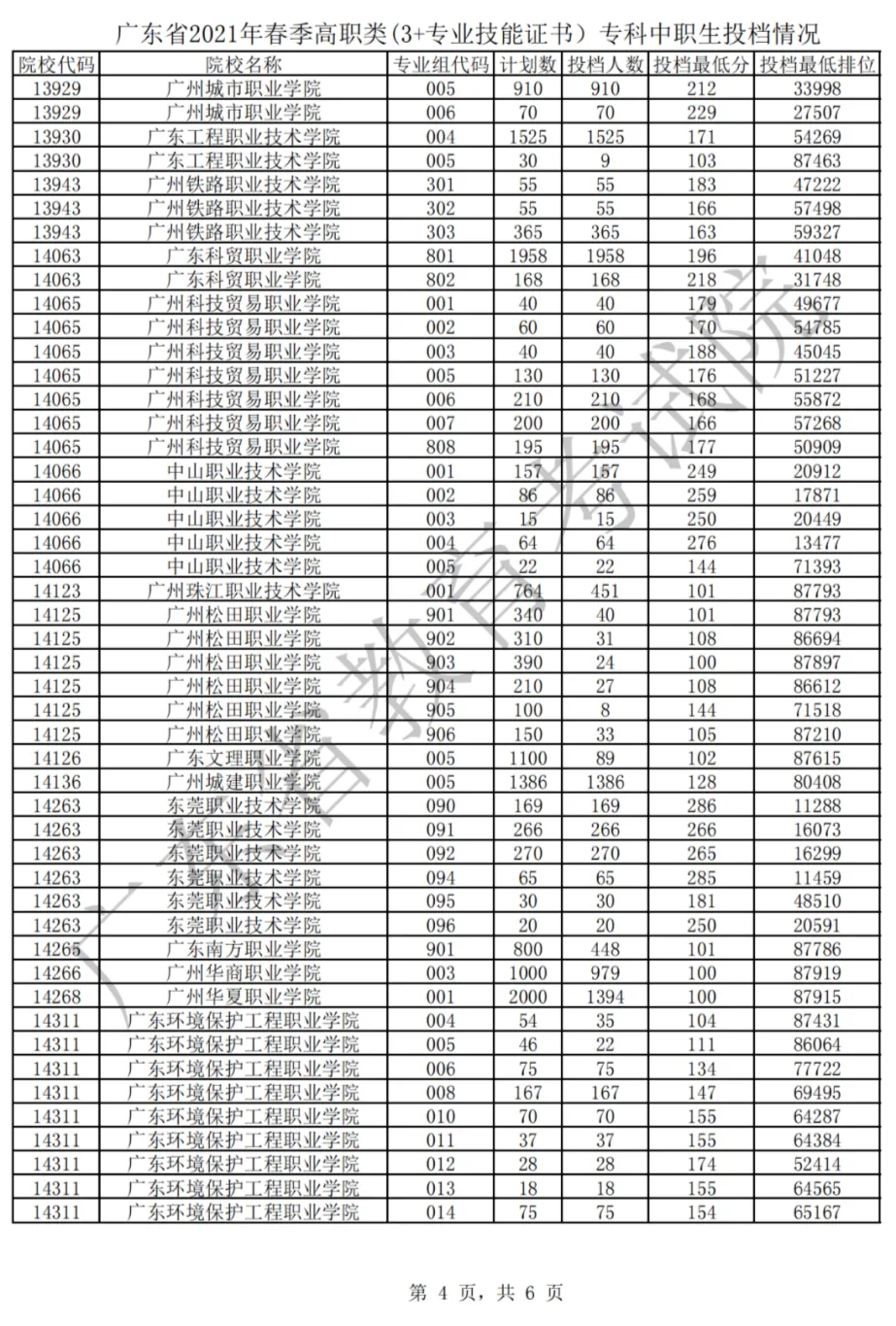 三是公办高职院校稳居“热门赛道”。从专科批次投档情况看,“依学考成绩录取”普通类一次性满档的院校专业组有185个,“3+证书”专科中职生一次性满档院校专业组有267个,均以公办高职院校为主,珠三角地区办学基础较好的院校、老牌优质院校依旧生源充足。如“依学考成绩录取”普通类的深圳职业技术学院、广州番禺职业技术学院、顺德职业技术学院、广东轻工职业技术学院、深圳信息职业技术学院部分院校专业组投档分数线均超过370分,分别为392分、378分、377分、371分、370分。“3+证书”专科中职生批次的深圳职业技术学院、广州番禺职业技术学院部分院校专业组投档分数线均超过340分,分别为380分、346分。