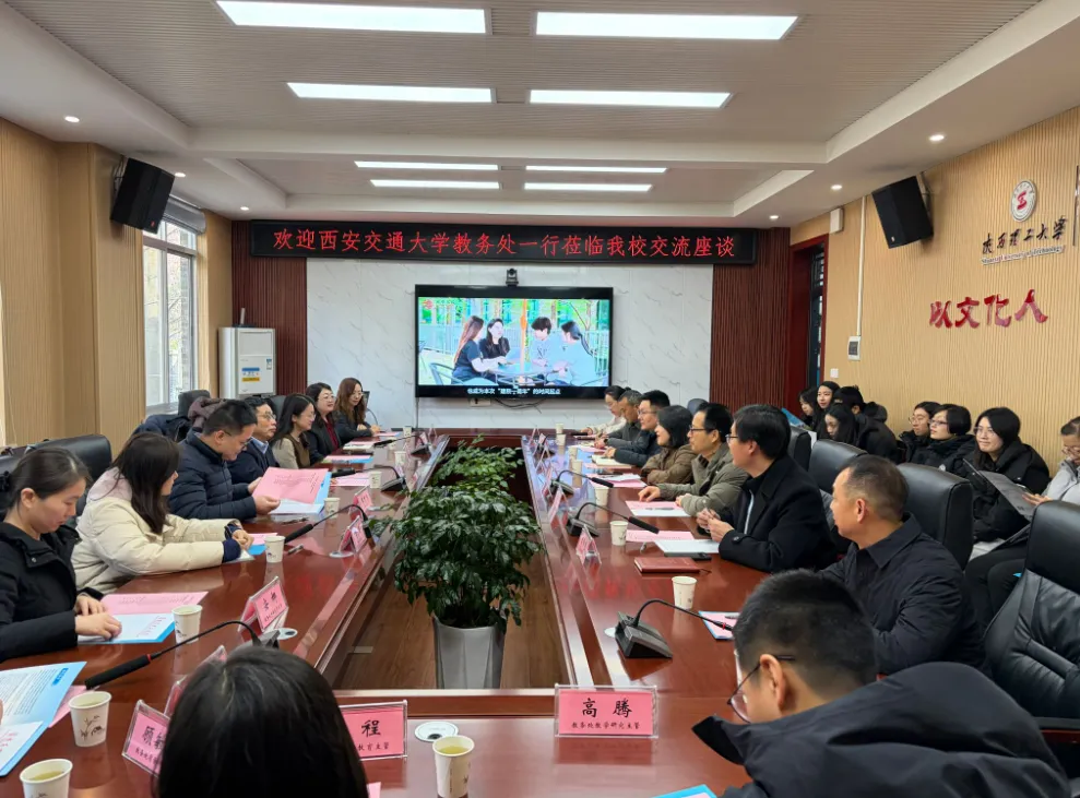 2026 年 1 月 10 日上午,西安交通大学教务处处长王秋旺一行 30 人莅临我校北校区参观交流。我校教务处处长谭娟、副处长王亚辉、处长助理王楠,博望书院院长宫臻祥、培源书院院长崔红、砺志书院院长黄朝军等相关部门负责人热情接待了来访客人,双方在博望书院 207 会议室举行座谈。座谈会由谭娟主持。