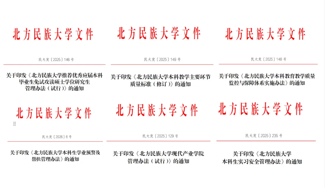 紧扣教学质量保障核心,不断健全学校人才培养制度体系,制(修)订《北方民族大学本科教育教学质量监控与保障体系实施办法》《北方民族大学现代产业学院管理办法》《北方民族大学推荐优秀应届本科毕业生免试攻读硕士学位研究生管理办法》等19项管理文件,为提升办学质量与人才培养水平筑牢制度根基。