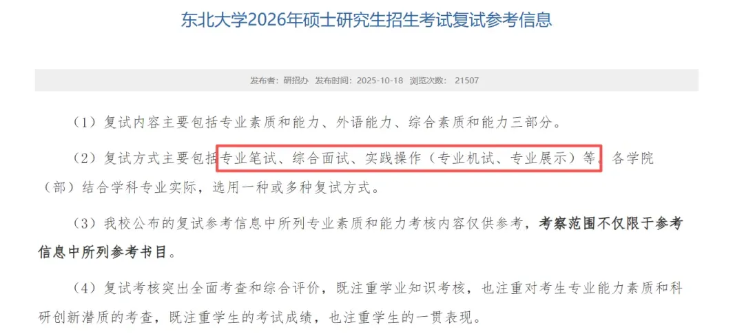 东北大学发布的2026硕士研究生复试参考信息明确,复试包含专业笔试、综合面试、实践操作等多种方式,各学院可自主选择。