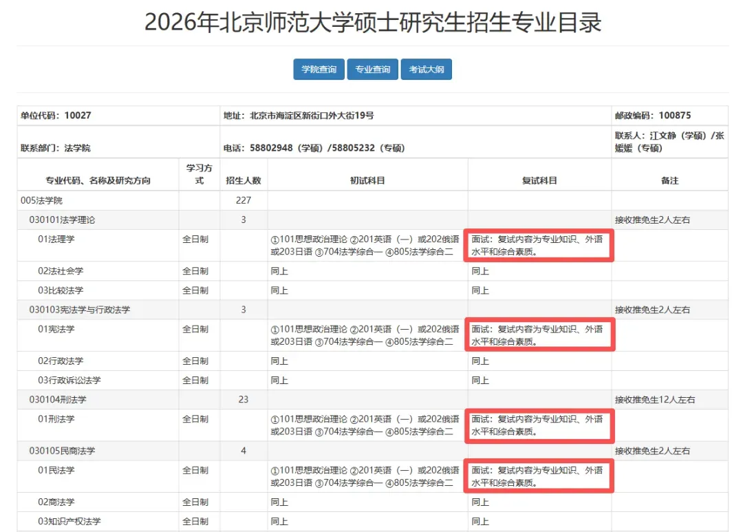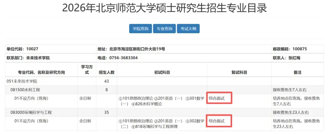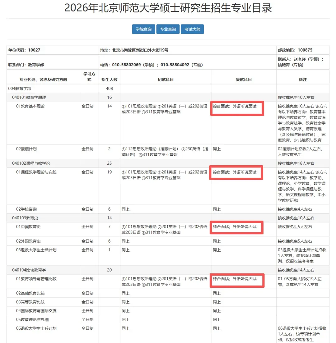 北京师范大学2026年硕士招生专业目录显示,教育学部、法学院、地理科学学部、未来技术学院等多个院系,复试均不设笔试,统一以综合面试形式考核,涵盖专业知识、外语听说能力等核心要点。