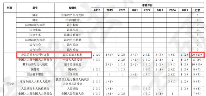 例如给大家汇总的近十年【法硕真题考频表】,看下图可以发现xian法【公民的基本权利】知识点在近十年竟考了40次!40次!直接出现在题干中就高达20次!