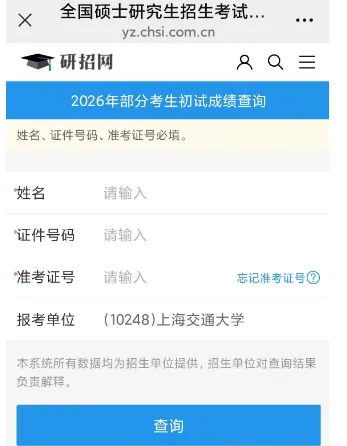 ,可以直接打开到目标院校查分入口(如下图),具体查分地址,可以在51考研网公众号对话框回复:查分,就可以看到链接,然后替换目标院校招生代码就可以啦!往年就有不少同学,用五姐说的方法,在学校测试上传成绩期间,抓住“漏洞”提前查到了成绩。