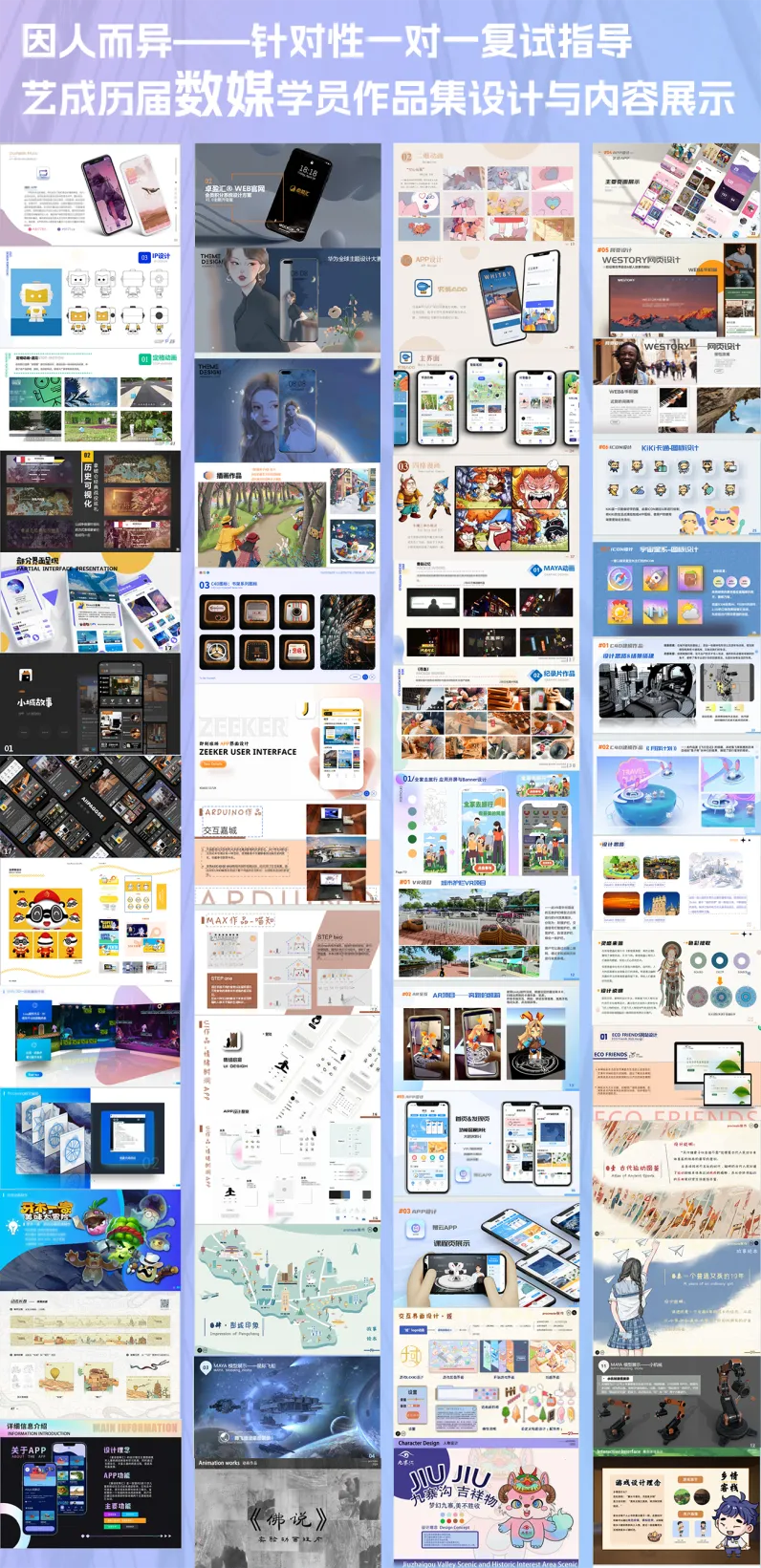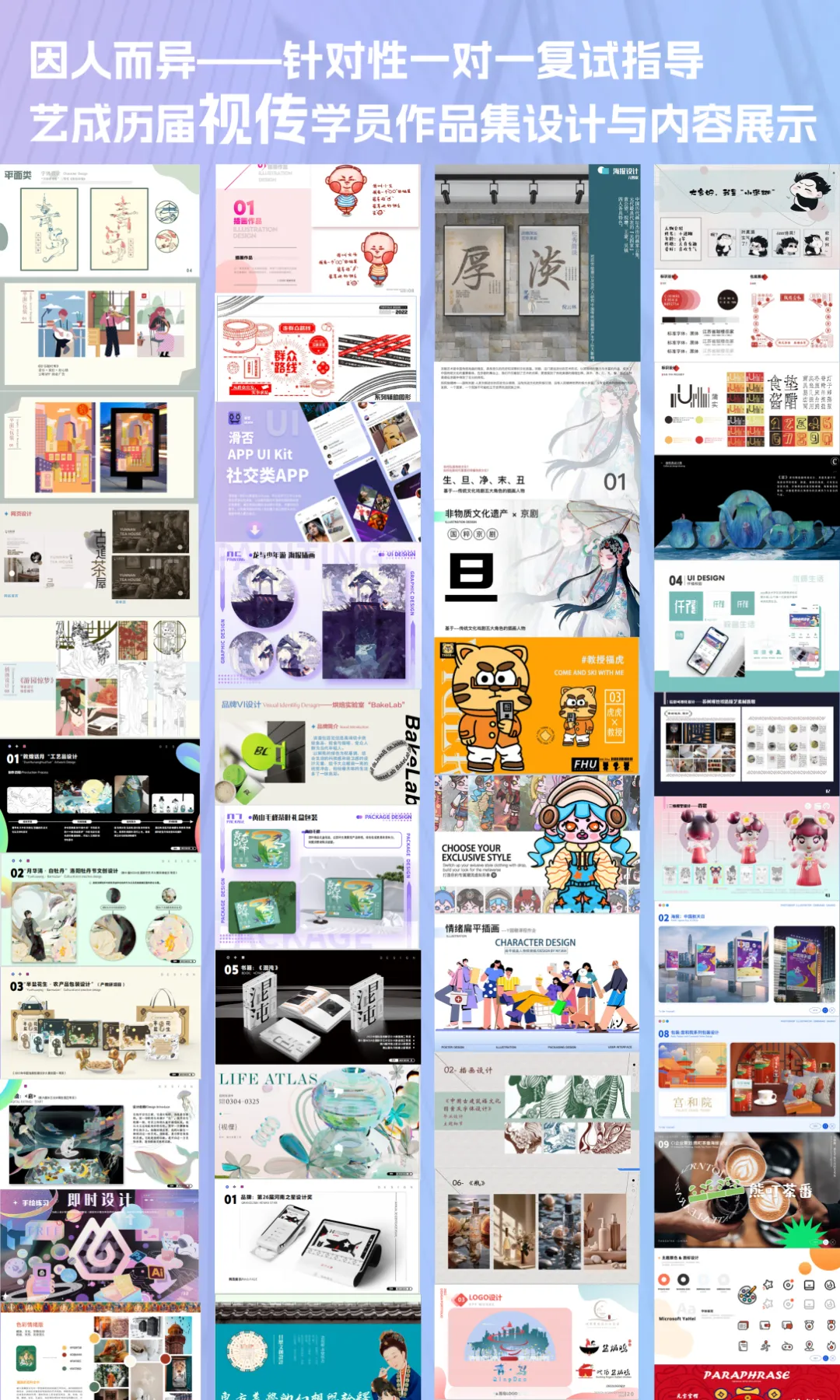 艺成25届、24届复试班学员上岸率更是100%,也连续多届包揽针对院校设计考研各专业初试、复试第一名,在这里我们有海量上岸学员优秀作品集供你参考,给你提供上岸经验全方位引导。