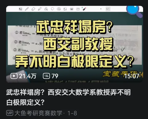 ❝我们今天不讲题目,来聊一聊考研数学饭圈化这一件事情,这件事情很简单,一句话概括就是西安交大数学系教授把最基础的数列极限定义给讲错了,相信对极限定义比较了解的小伙伴都清楚,极限定义里的对于任意的与对于任意给定的他俩说的其实是一个意思,这个给定有没有都行,并且视频里解释的很清楚了武忠祥他的方法错在了哪里.但是这个视频下面的评论区简直辣眼睛....真的属于是一天不看难受,看了难受一天,看完评论区让读者深刻的明白了看来提高考研数学学生的平均分的任务还是任重而道远,这绝非是一朝一夕可以办到的事情,每年考研数学平均分在70分左右徘徊并非是毫无道理的.