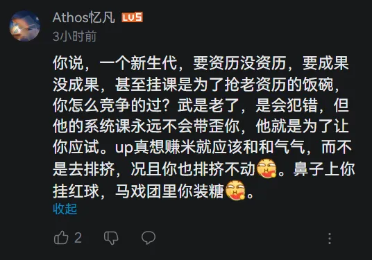 ❝这个视频底下只有少数的人赞同笔者,认为笔者讲的是对的,武忠祥讲错了,但是终究是少数,对这些头脑清醒的人点赞,这些具有自己独立思考的年轻人才是祖国未来的栋梁,像评论区那种没开智的碳基生物,你们就是祖国未来的挑担,会社的英精,民族的脊拔,人民的桂头.