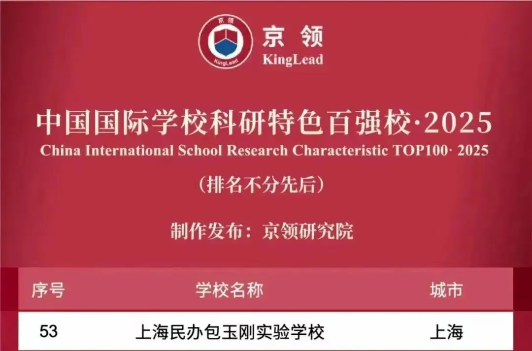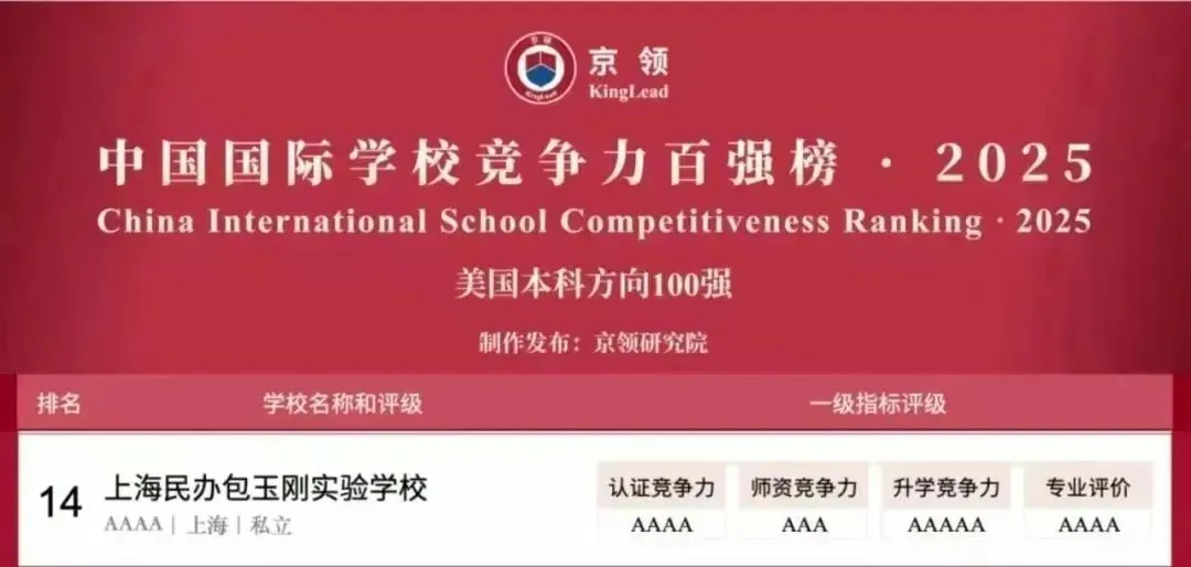 上海民办包玉刚实验学校凭借优秀的办学实力,荣登京领2025中国国际学校竞争力百强榜·美国本科方向,获4A评级。