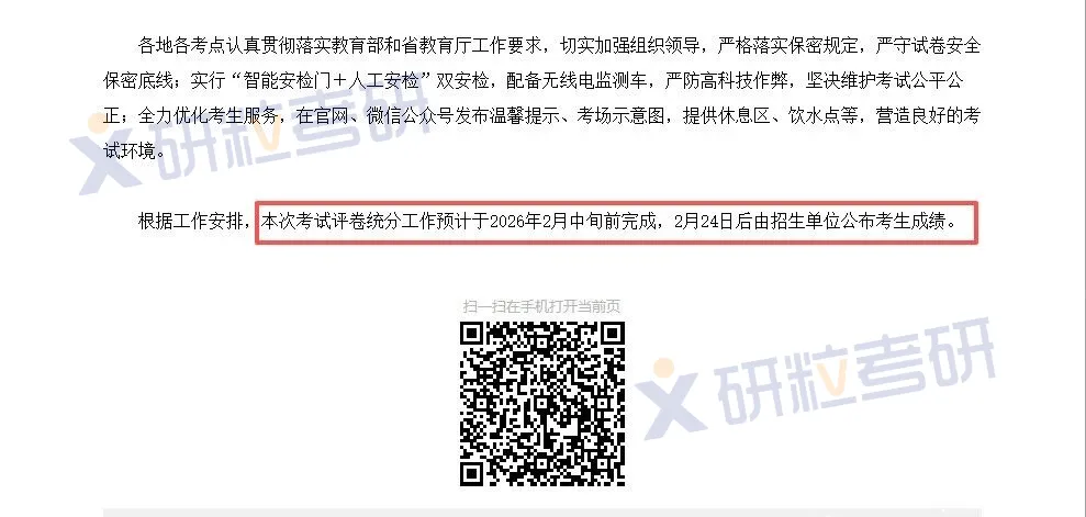 根据工作安排,本次考试评卷统分工作预计于2026年2月中旬前完成,2月24日后由招生单位公布考生成绩。