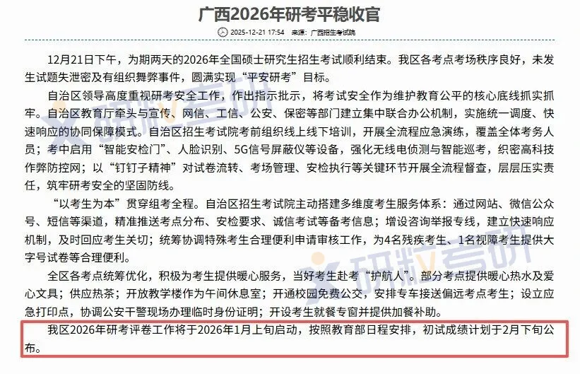 我区2026年研考评卷工作将于2026年1月上旬启动,按照教育部日程安排,初试成绩计划于2月下旬公布。