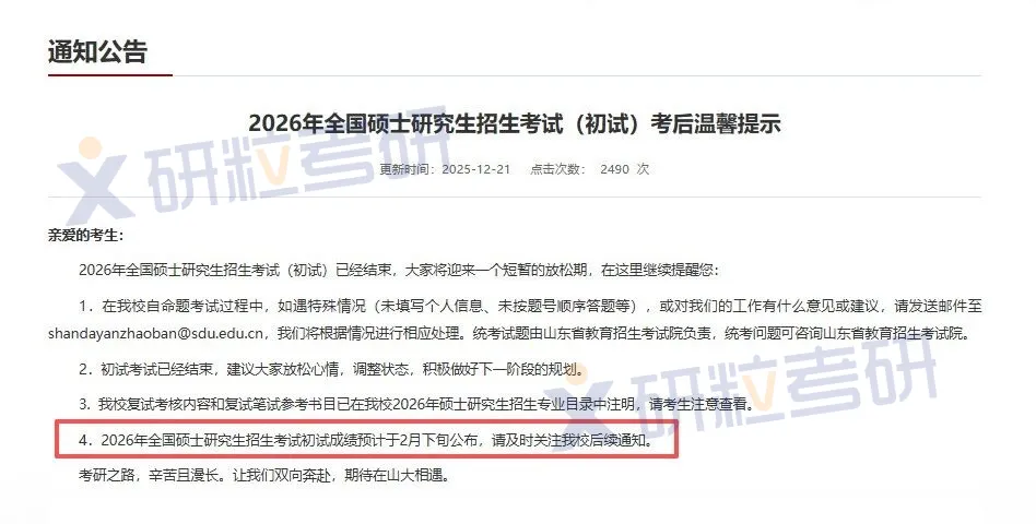 2026年全国硕士研究生招生考试初试成绩预计于2月下旬公布。