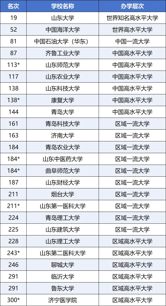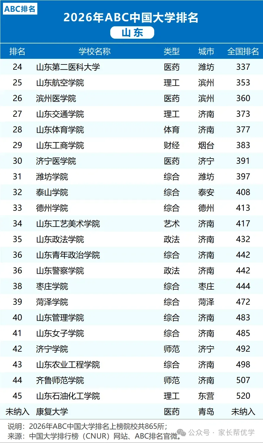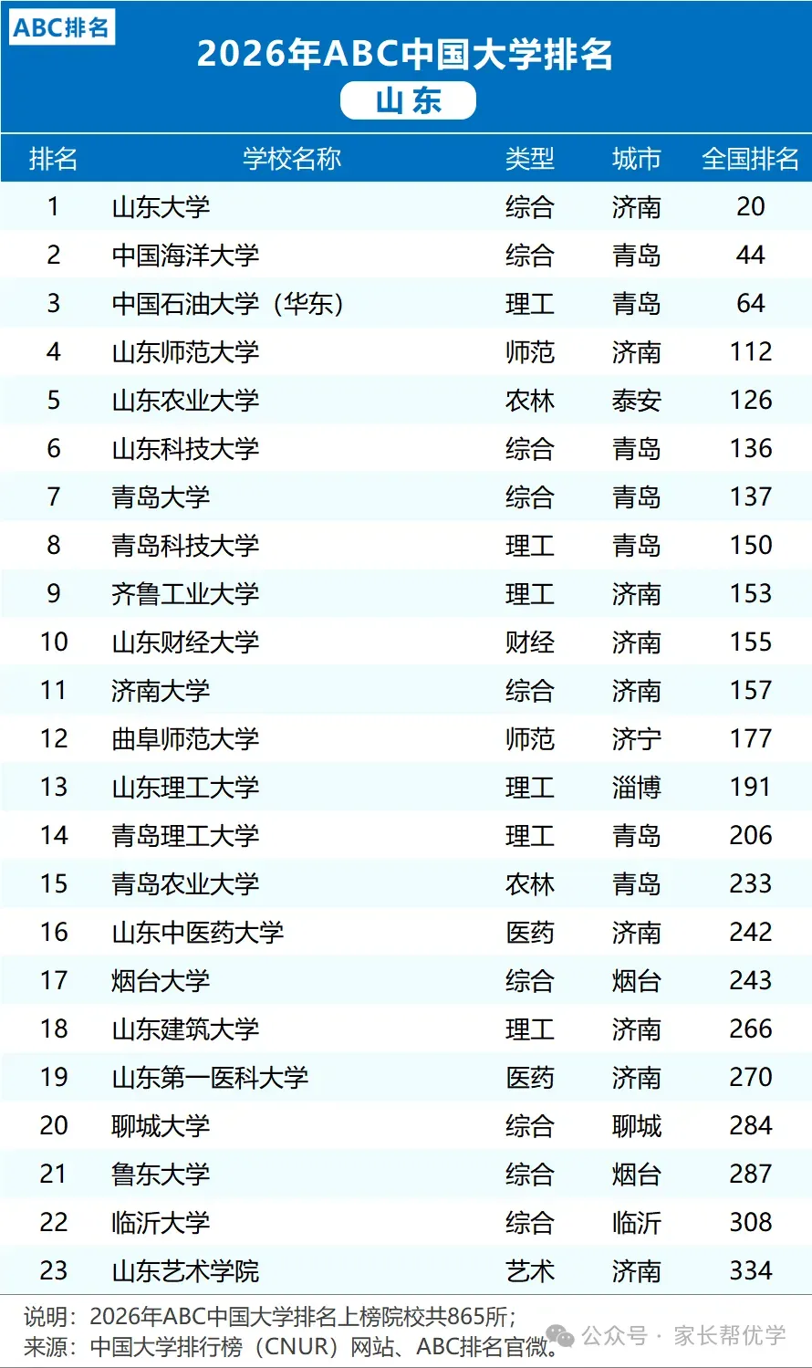 2026年ABC中国大学排名中,山东省45所公办本科院校上榜(康复大学未纳入)!其中山东大学(20)、中国海洋大学(44)、中国石油大学(华东)(64)进入全国排名前100。