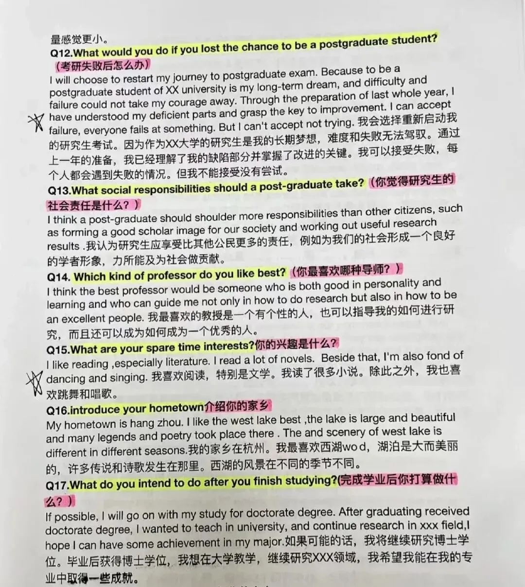 锦鲤来啦!沾沾喜气~去年我就是靠着这份自己整理的英语问答库,复试时英语对答如流!现在把真题和答案都分享给大家,接住这份好运,我们一“研”为定!