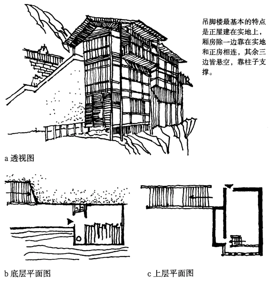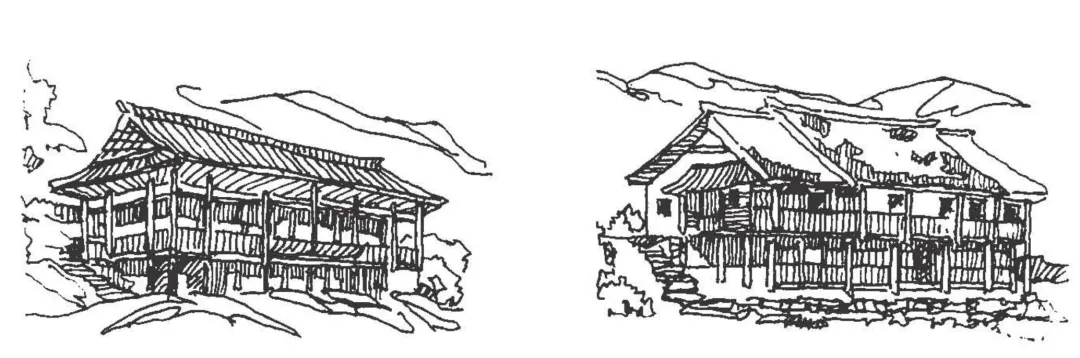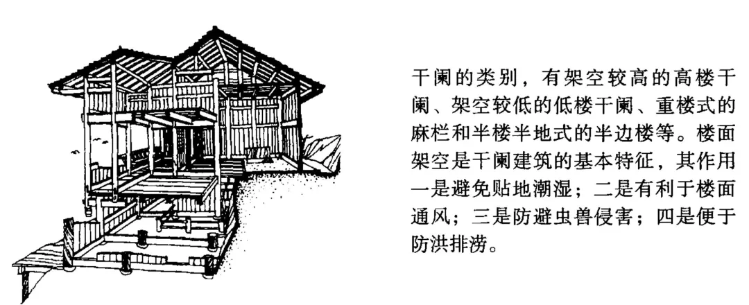 9、贵州黔东-左:干阑式建筑典型,底层架空,木材围合。