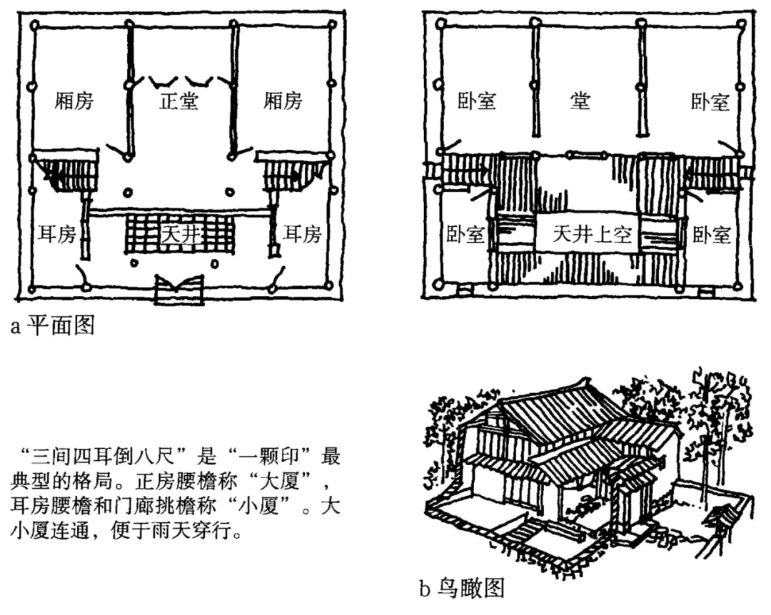 此形制是云南地区普遍采用的住屋形式,由正房、耳房和入a门墙围合成正方如印的外观,俗称"一颗印"。