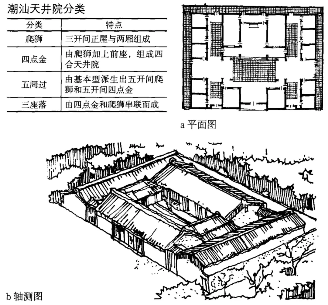 潮汕地区的天井院,在不同地区有不同类别和名称。其有两种基本型:一是"爬狮",二是"四点金",并在这两种类型基础上又产生例如"五间过"等变体组合。