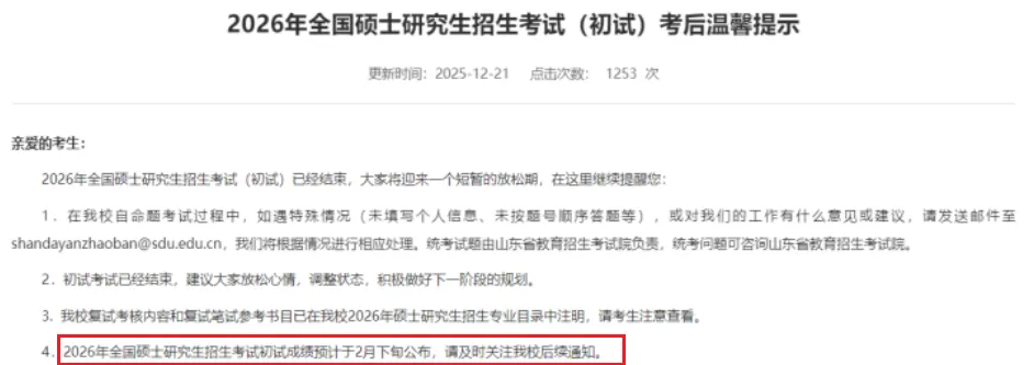 🔺 山东大学:2026年全国硕士研究生招生考试初试成绩预计于2月下旬公布