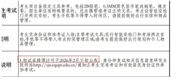 🔺 重庆邮电大学:初试成绩预计可于2026年2月下旬公布