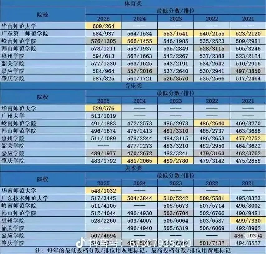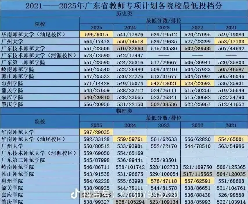 现在给大家展示一下2021年到2025年广东教师专项的院校及录取分数线