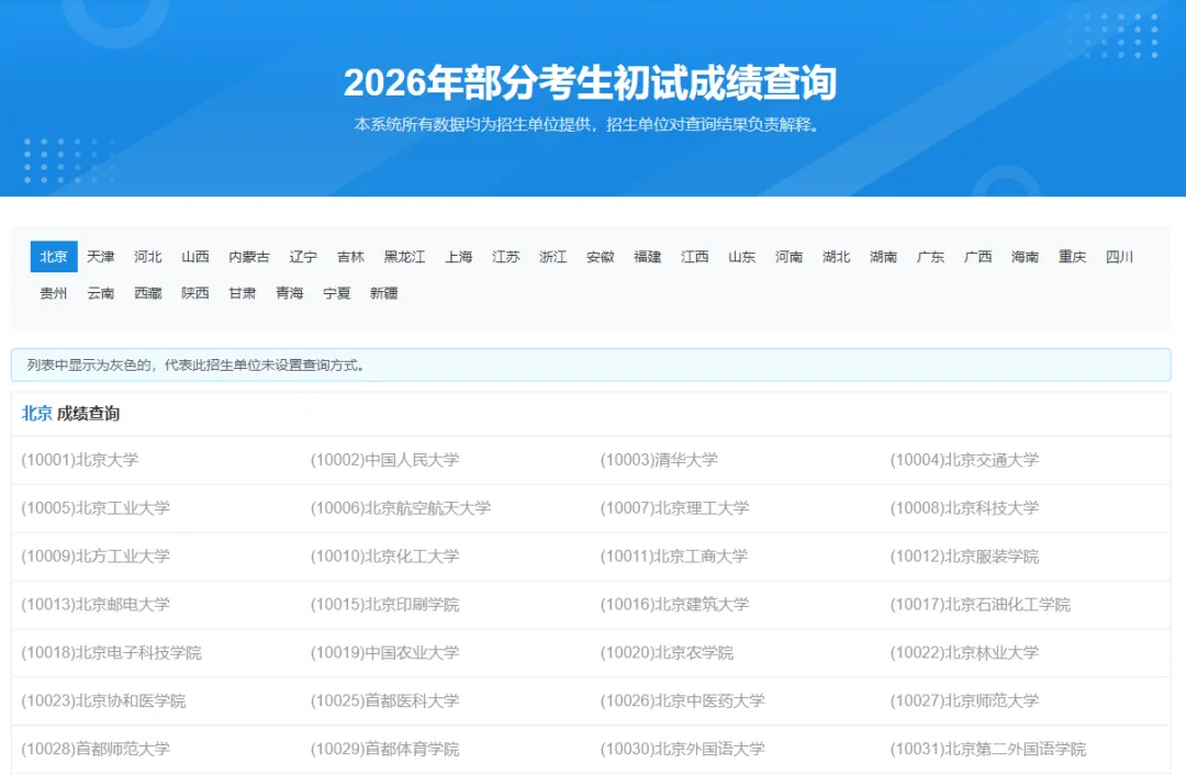 目前列表中显示的各所院校依然为灰色的,代表查询通道还未开启。等到学校名称从灰色变成能点击进去的黑色,那就说明考研成绩要和大家见面了!届时大家点击自己的目标院校,输入姓名、证件号码、准考证号等就可以进行查询啦!