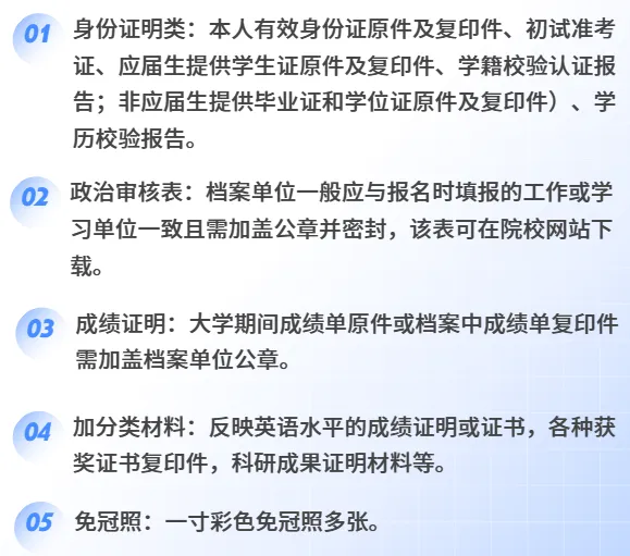 参加复试前,请准备好以下材料,并妥善装订,仔细核对。