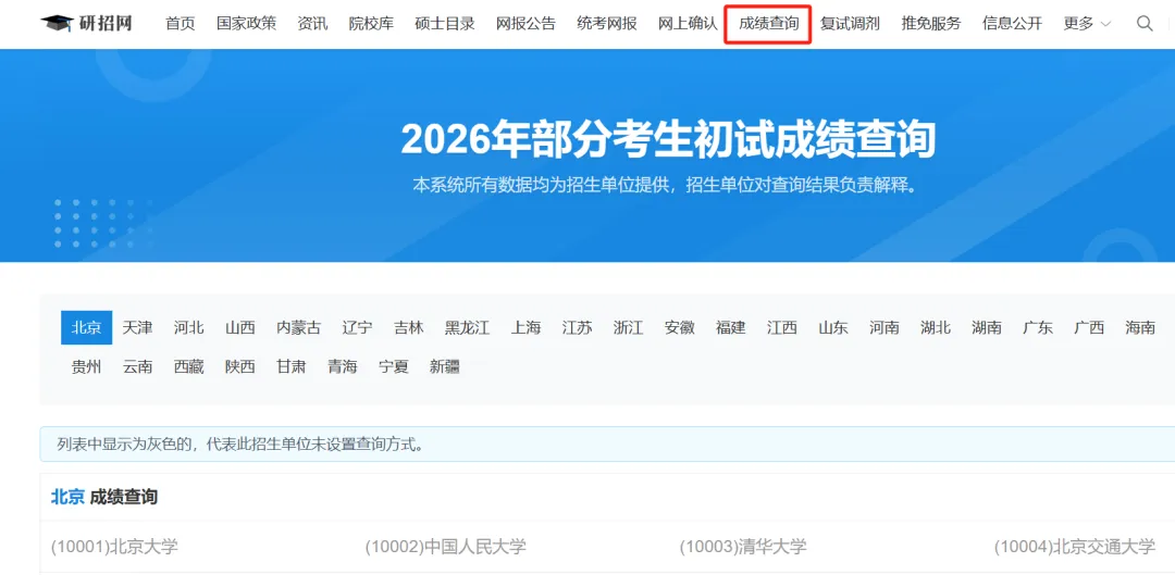 今天看到研招网的查分界面已经更新,现在列表中的各个院校依旧显示为灰色,等学校名称从灰色变成黑色,大家就能进系统查成绩了。