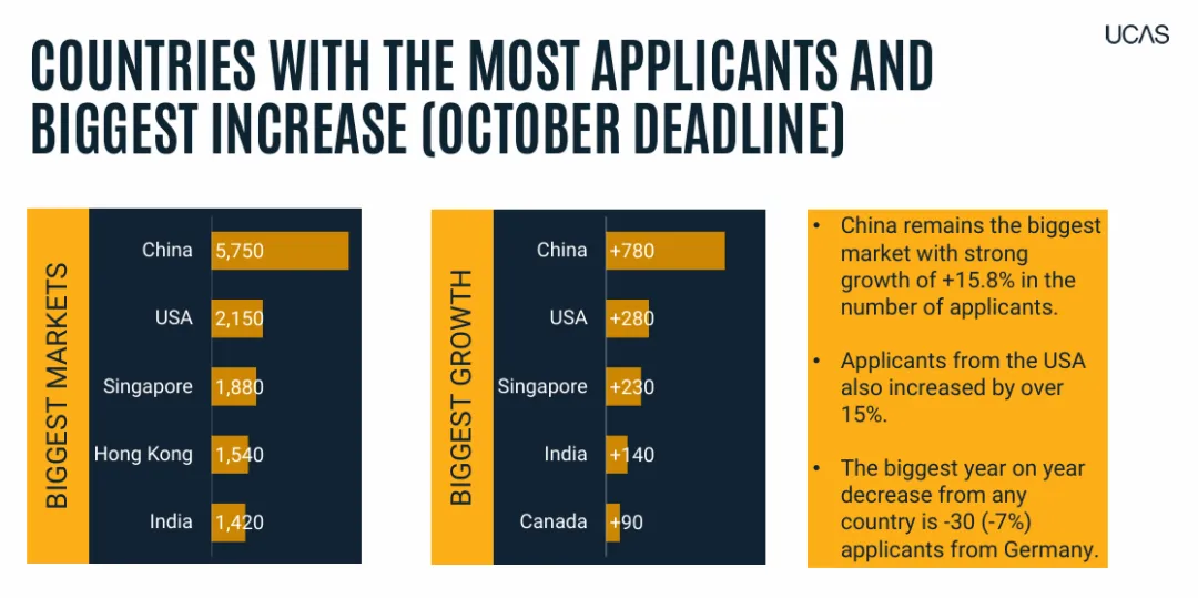近期,UCAS公布了2026年第一轮申请统计数据,仅在第一轮(截至10月15日),中国大陆申请人数就达到5,750人,较去年同期大幅增长了15.7%。相比之下,新加坡的申请者仅约1,880人。