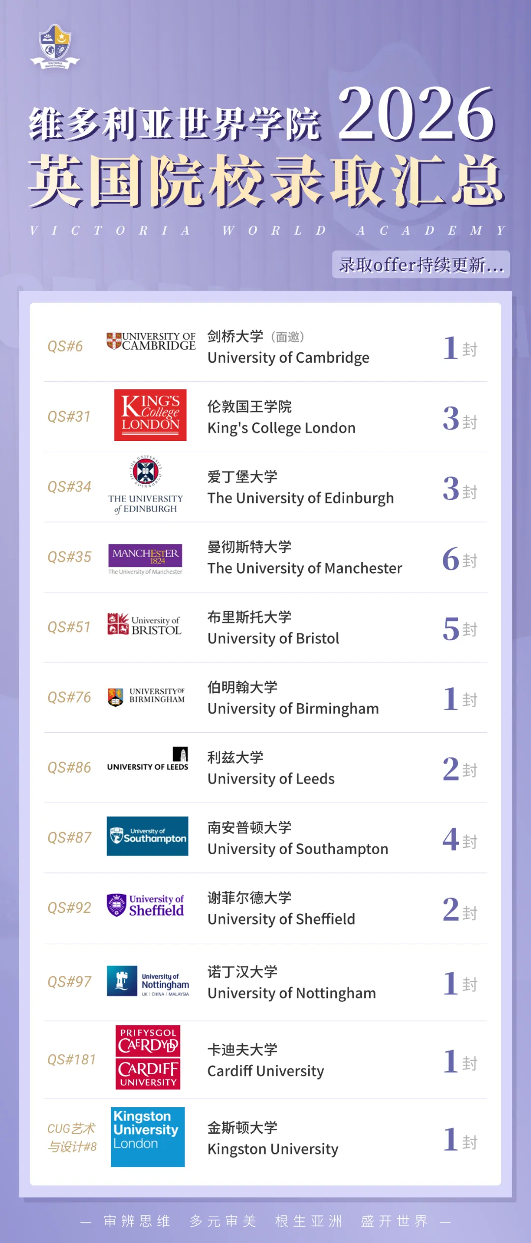 截至1月13日,维多利亚世界学院共收获59枚offer,其中英国方向offer30枚,占比约51%。
