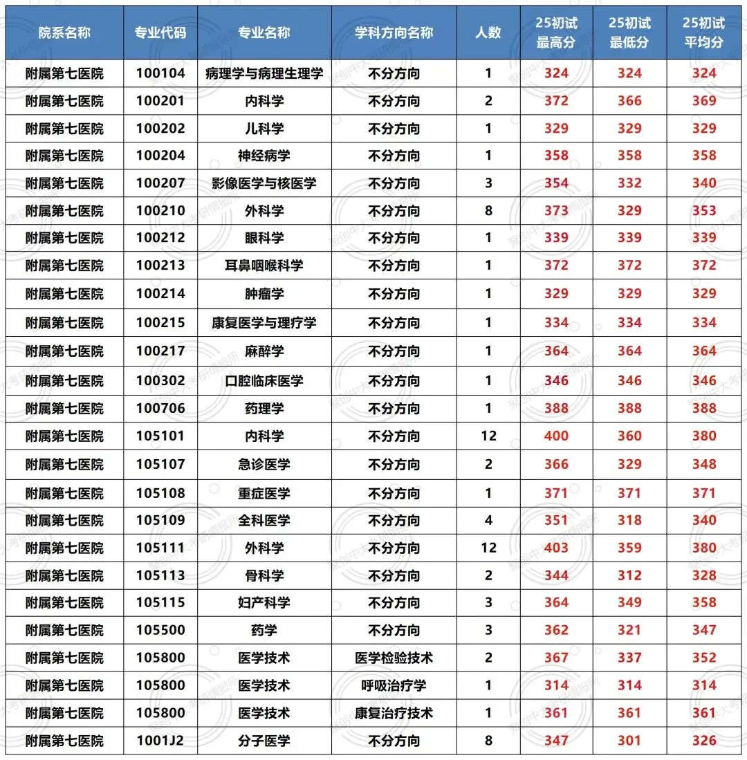 >25考研情况|中山大学附属第七医院各专业初试最低分、最高分、平均分汇总!