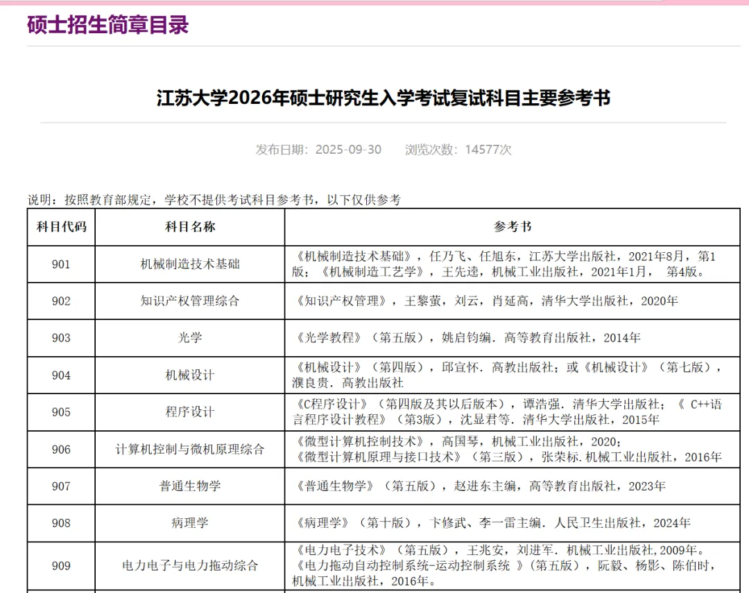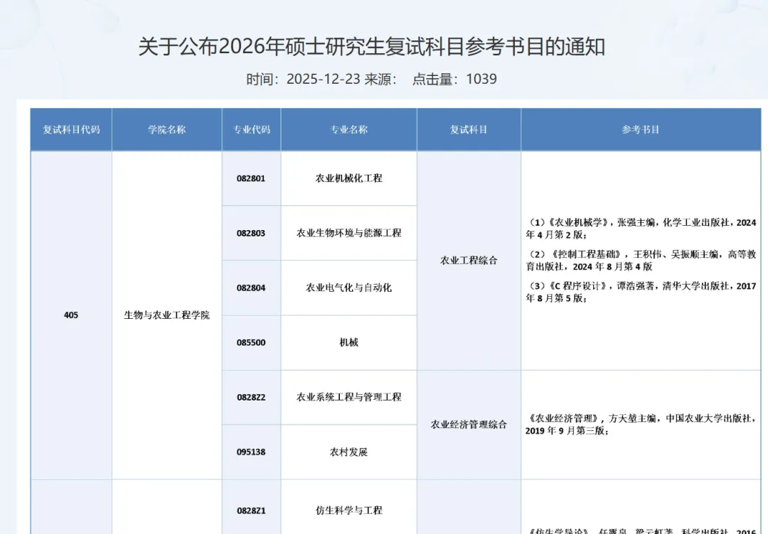 吉林大学生物与农业工程学院仿生科学与工程学院发布2026年硕士研究生复试科目参考书目。