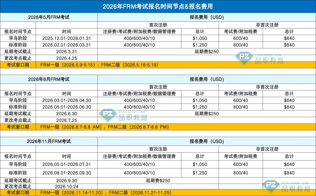 第一次报名FRM第一部分考试时,首次注册FRM考试的考生需支付注册费400美元。GARP将为每次考试报名提供 “早鸟价”和 “标准价” 两个报名阶段,一般来说早鸟价600美元,常规价800美元。