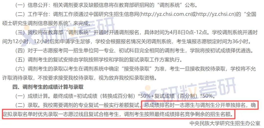 我校需要调剂的专业复试一般实行差额复试,总成绩排名时一志愿生与调剂生分开单独排名,确定拟录取名单时优先录取一志愿过线且复试合格考生,调剂考生按照最终成绩排名竞争剩余的招生名额。图 |中央民族大学研究生院