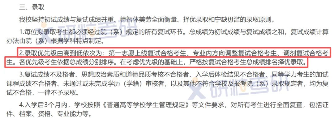 录取优先级由高到低依次为:第一志愿上线复试合格考生、专业内方向调整复试合格考生、调剂复试合格考生。各优先级考生依据总成绩分别排序。在考虑优先级的基础上,严格按复试合格考生总成绩排名择优录取。