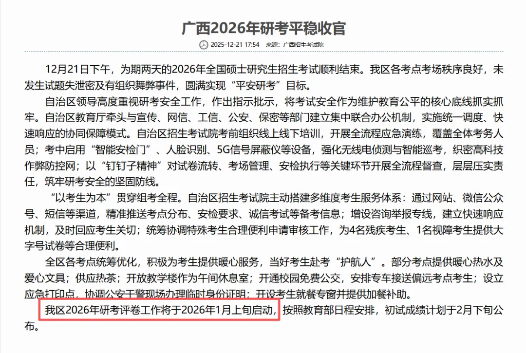 26考研初试已经过去三周了,近期有网友发帖称已经查询到初试成绩?学长提醒同学们,根据广西、江西等多省招生考试院发布的官方消息,26考研阅卷工作在1月上旬才正式启动!