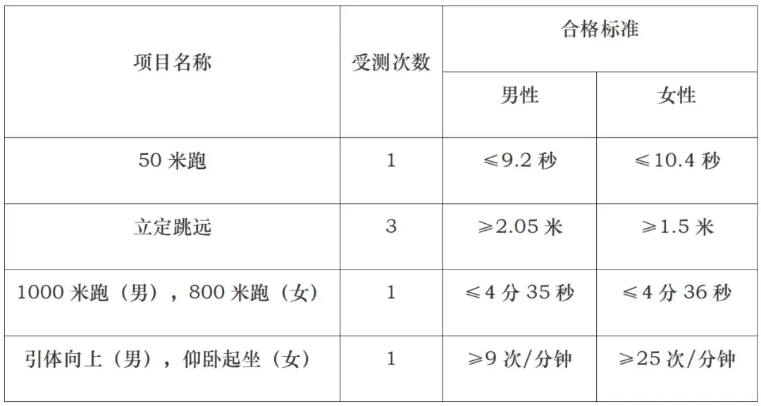 体测项目包含4个(如下表),考生应当参加全部4个项目的测评,3个及以上项目达标的考生,其体测结论为合格。