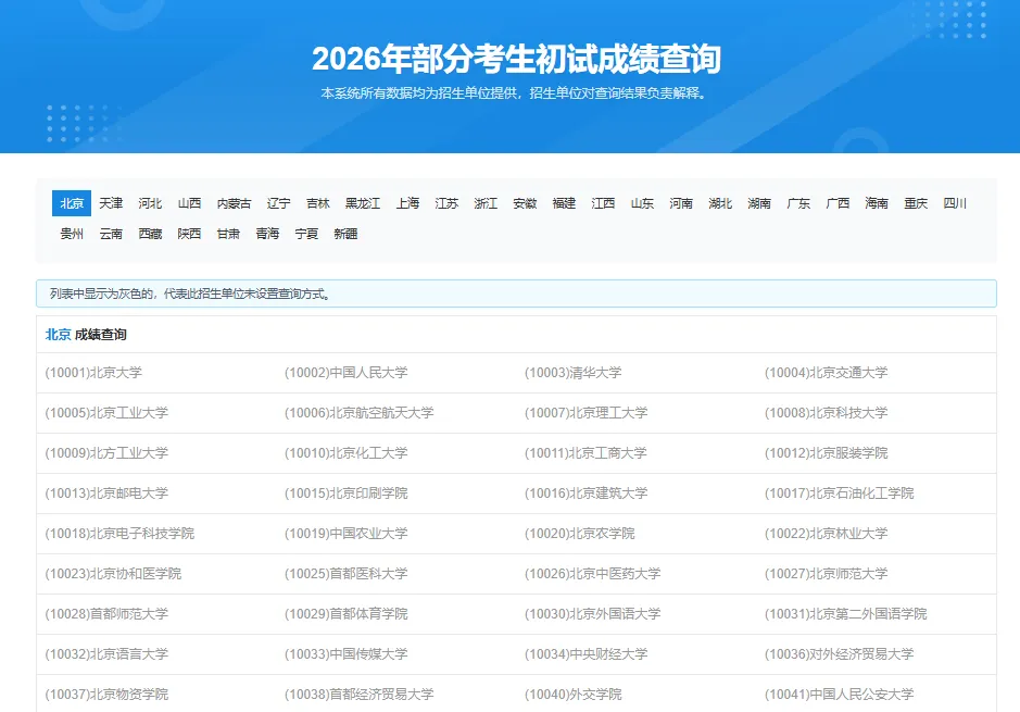 哈喽!各位准研究生们,26考研初试已经结束半个月了!今年过年比较晚,寒假也相对迟一些,不知道大家都开始放寒假了吗?初试结束后,大家基本都在等下个月成绩出炉,已经开始期待了~研招网更新了26考研初试查分界面!就等各地阅卷结束、统分、上传分数咯~目前各招生单位未设置查询方式。