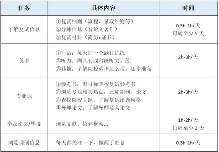 主要任务涉及到了解复试信息、英语复习、专业课复习,以及准备毕业论文/毕设、浏览调剂信息,当然也包括了制作简历、联系导师、自我介绍、面试模拟等细节。