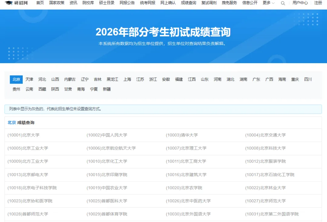 研招网查分界面更新啦,目前显示的各大院校还是灰色的,代表此招生单位未设置查询方式。等到变成黑色,那可以查询成绩了!查分页面更新说明阅卷基本完毕,各省预计将在2月下旬陆续公布成绩。